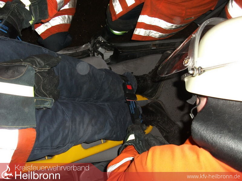 Angenommen wurde ein Unfall mit einer verletzten Person (Fahrer). Je nach Art der angenommenen Verletzung wurden mehrere Szenarien durchgesprochen und geübt. Mit Hilfe des Spineboard, welches im letzten Jahr neu beschafft werden konnten standen mehrere Möglichkeiten der Personenrettung zur Verfügung. Die erste Möglichkeit bietet sich über eine seitliche Stabilisierung und aus dem Fahrzeug herausbeugen der Person, wenn diese z.B. wegen eines Herzinfarktes nur vom Sitz auf das Board gelegt werden müsste. Eine weitere, filigrane aber schnelle Möglichkeit bietet sich z.B. im Falle einer Beschädigung der Fahrzeugkarosserie auf der Fahrerseite. Hier könnte die Person auf das durch die eingeschlagene Heckscheibe und den zurückgestellten Sitz eingeschobene Spineboard gelegt werden. Auf diesem fixiert kann der Verletzte dann durch die Heckscheibe aus dem Fahrzeug herausgezogen werden.