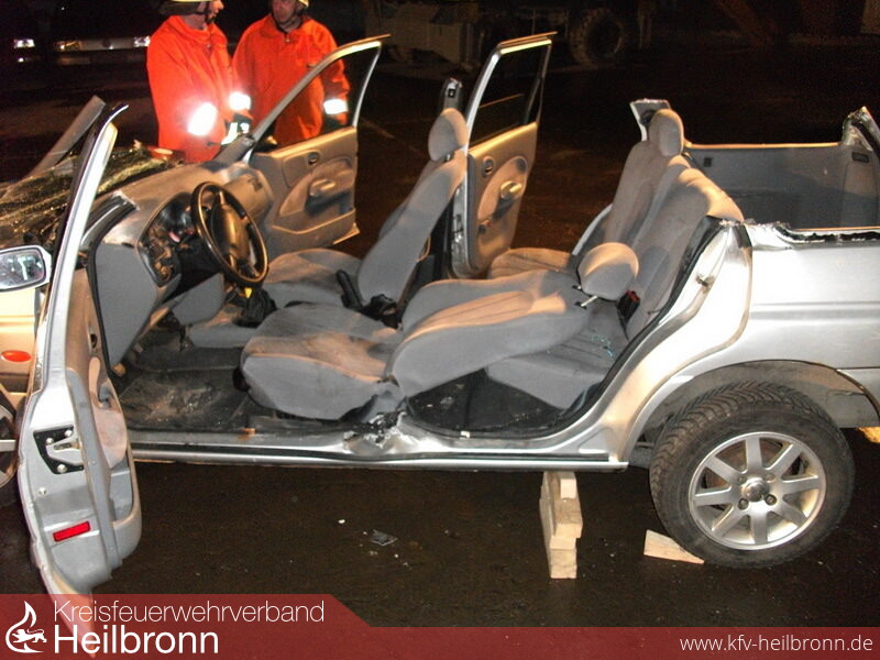 Der größte Aufwand war die "übliche" Lösung, das Dach mithilfe der hydraulischen Schere von der restlichen Karosserie zu trennen und den Verletzten auf diesem Wege mit maximalen Freiräumen zu retten. Die traditionelle Szenerie wurde jedoch dadurch geändert, dass angenommen wurde hinter dem Fahrzeug befände sich ein Wohnanhänger, wodurch das Wegklappen des Daches nach hinten nicht den maximal möglichen Rettungsraum versprechen würde. Daher wurde das Dach vom Heck beginnend entfernt und über die A-Säule und Windschutzscheibe nach vorne geklappt. Die B-Säule wurde mitsamt der Fond-Türe ebenfalls entfernt. Ein weiterer Vorteil dieser Methode besteht darin, dass das Sägen der Windschutzscheibe entfällt und dadurch das Verletzungsrisiko durch Splitter für den Verunfallten selbst und die Einsatzkräfte minimiert werden kann. Der Verletzte konnte dann wieder mit zurückgeklapptem Sitz auf das Spineboard gelegt, fixiert und hätte im Ernstfall dem Rettungsdienst übergeben werden können.