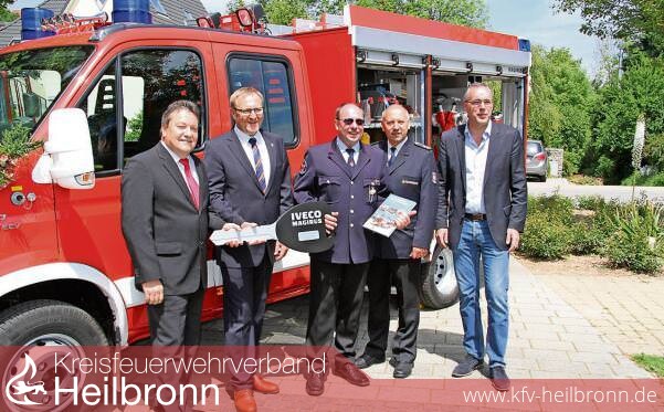 Bild: Freude über das neue Feuerwehrfahrzeug: Uwe Freidinger, Michael Grimm, Nico Saur, Uwe Thoma und Bernhard Lasotta. (Foto: Anita Ludwig)