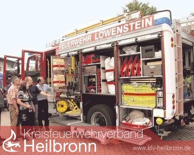 Auf Hochglanz poliert, mit einem roten Gerbera-Bouquet auf der Kühlerhaube, die Klappen und Rollläden des Laderaums weit geöffnet, steht das neue Hilfeleistungs-Löschgruppenfahrzeug (HLF 20/16) der Freiwilligen Feuerwehr (FFW) Löwenstein auf dem Hof vor dem Feuerwehrmagazin „Wir sind wunschlos glücklich“, freuen sich die Löwensteiner Feuerwehrmänner Guido Schock und Markus Wagner, die am Sonntagnachmittag für Besucher des Feuerwehrfestes „Führungsdienst am Fahrzeug machen.