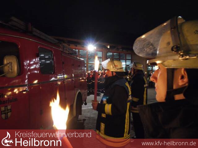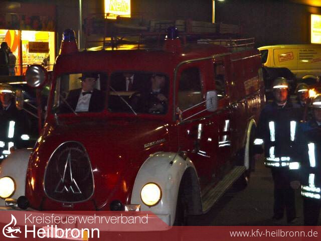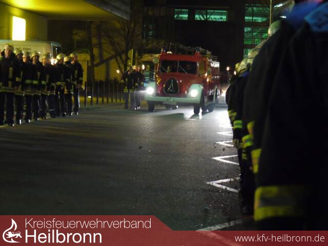 Begleitet von einem Fackelzug der Feuerwehrabteilungen Neckarsulm, Obereisesheim und Dahenfeld rollte der auf Hochglanz polierte Oldtimer auf den Hof der Feuerwache. Dort wurde der Jubilar von 250 geladenen Gästen erwartet. Zu den Gratulanten zählten Stadt- und Ortschaftsräte, die Neckarsulmer Ehrenbürger Dr. Erhard Klotz, Kurt Bauer und Volker Blust, der Vorsitzende des Kreisfeuerwehrverbandes Heilbronn und Landtagsabgeordnete Reinhold Gall, der Erste Landesbeamte Lutz Mai, Kommandanten befreundeter Wehren aus der Nachbarschaft und Vertreter des Polizeireviers Neckarsulm.