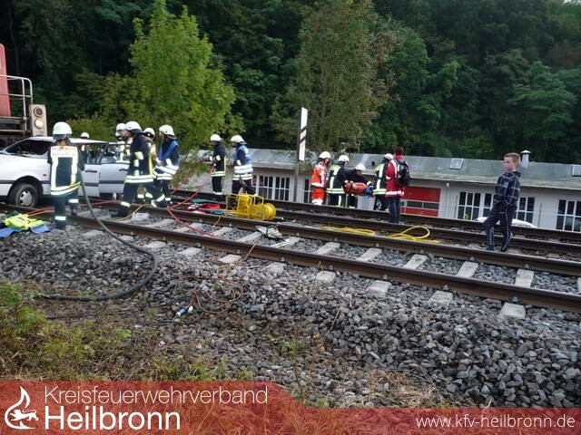Und doch bringen es die großen Aufgaben Personenrettung, Brandbekämpfung und Gefahrengutaustritt mit sich, dass drei Einsatzabschnitte gebildet werden. Vor allem die Rettung hat es in sich. Spreizer und Schere kommen zum Einsatz, das Pkw-Dach wird aufgeschnitten. Eine Person, als schwer verletzt deklariert, bekommt ein spezielles Rettungssystem umgelegt und wird mit der Drehleiter aus dem Auto geholt. Gleiches wiederholt sich beim Lokführer. Zur Sicherheit ist die Oberleitung der Bahn ausgeschaltet, Vertreter des DB-Notfallmanagements sind ebenfalls alarmiert und vor Ort.