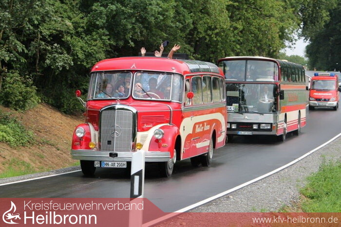 Hier war allerdings der Blick auf die historische Altstadt etwas getrübt, da der Himmel seine Schleusen geöffnet hatte und die Leute vor dem Regen eher Schutz als den schönen Ausblick suchten. Doch schon bei der anschließenden kurzen Wanderung zum nahegelegenen Feuerwehrhaus hörte der Regen auf und als die drei Oldtimer-Busse, Baujahr 1950, 1958 und 1971, im Hof vor der Fahrzeughalle entdeckt wurden, stieg die Stimmung bei allen Beteiligten nochmals deutlich an.