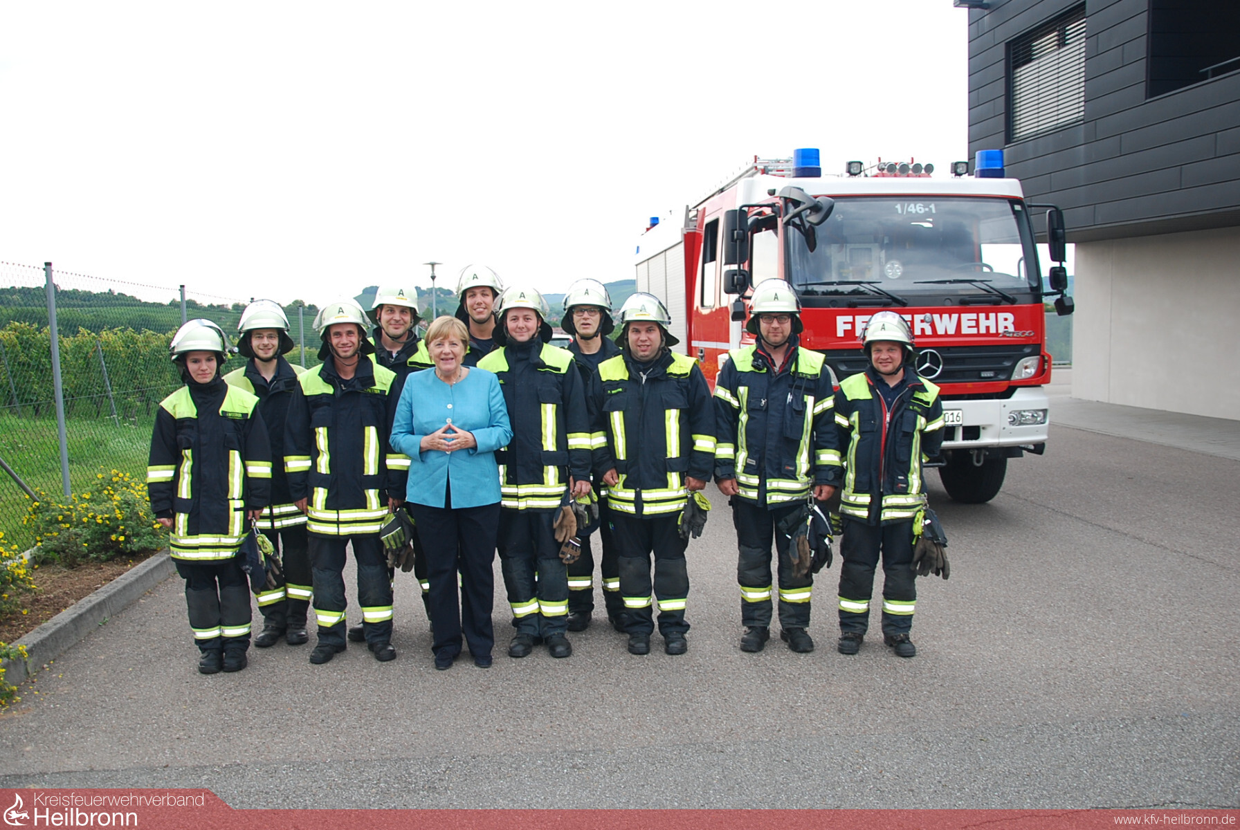 Bereits letzte Woche wurde die Freiwillige Feuerwehr Weinsberg durch das Polizeipräsidium Heilbronn für eine Brandsicherheitswache angefragt. Auf Grund der guten Zusammenarbeit mit der Verkehrspolizeidirektion Weinsberg war es für die Freiwillige Feuerwehr eine Selbstverständlichkeit hier die Polizei zu unterstützen. So ging es am Mittwochabend mit dem Kommandowagen und dem Hilfeleistungslöschfahrzeug zur Verkehrspolizeidirektion Weinsberg um hier den Brandschutz am Hubschrauberlandeplatz für eine Hubschrauberladung sicherzustellen. Denn niemand geringeres als unsere Bundeskanzlerin Angela Merkel kam hier mit dem Hubschrauber an, um dann mit ihrer Eskorte nach Heilbronn auf den Kiliansplatz zu einem Wahlkampfauftritt zu fahren. Im Gespräch mit den Personenschützern konnte man erfahren, dass es sich Frau Merkel nicht nehmen lässt die Feuerwehr persönlich zu begrüßen, da ihr die Hilfsorganisationen sehr am Herzen liegen. Direkt nach der Landung kam Frau Merkel zu uns ans Feuerwehrfahrzeug, begrüßte uns kurz und es wurde ein Gruppenbild gemacht. Im Anschluss ging es dann für Frau Merkel direkt nach Heilbronn. Die Kameraden und Kameradin der Freiwilligen Feuerwehr Weinsberg warteten auf ihre Rückkehr um auch den Start des Hubschraubers abzusichern. Mit einem freundlichen Winken verabschiedete sich Frau Merkel auf dem Weg zum Hubschrauber, bevor dieser abflog und am Himmel Richtung Berlin verschwand. Für die Einsatzkräfte der Feuerwehr Weinsberg war dies sicherlich ein unvergessliches Erlebnis und auch einmal etwas besonders, anders als die üblichen Einsätze.