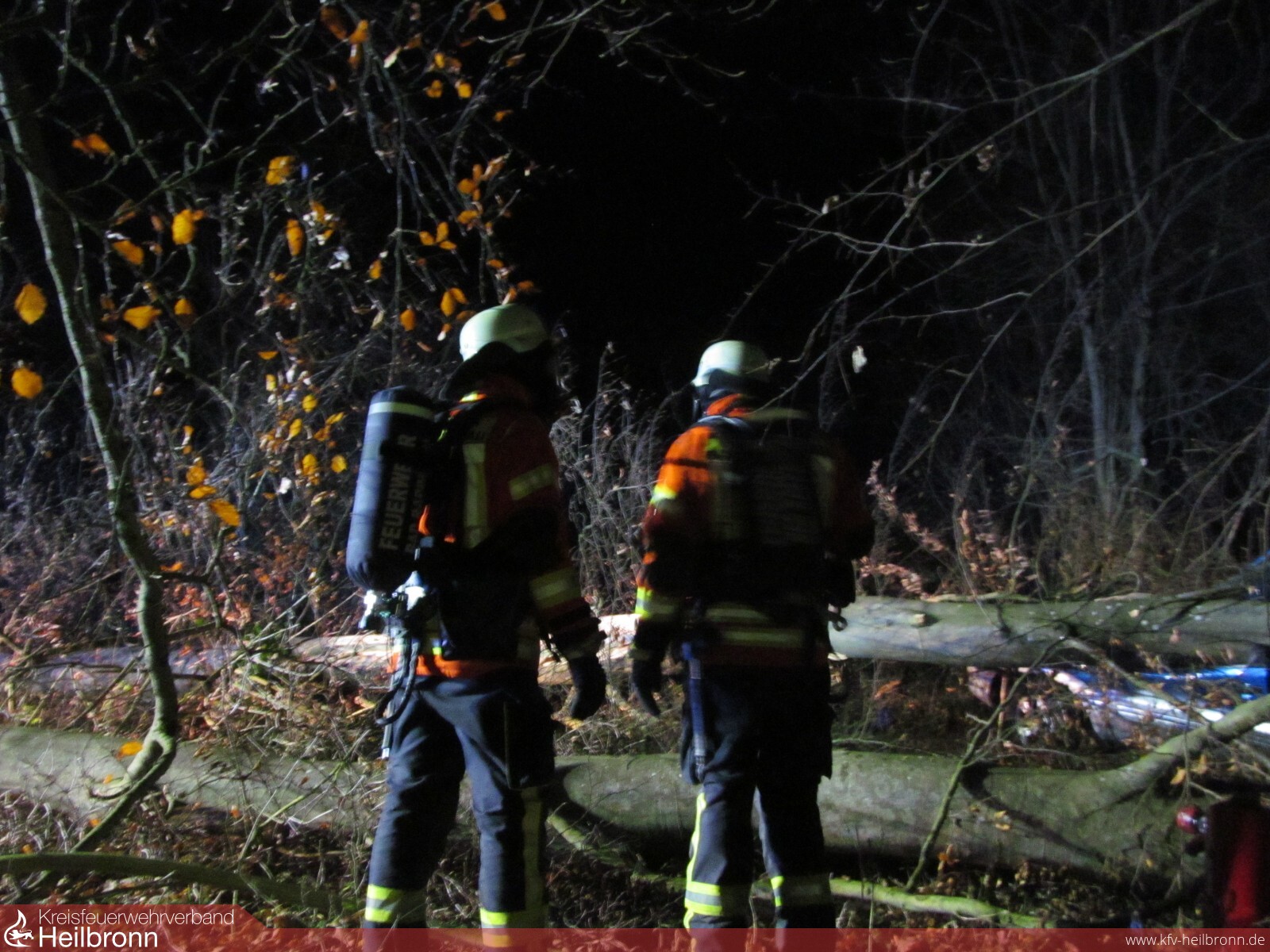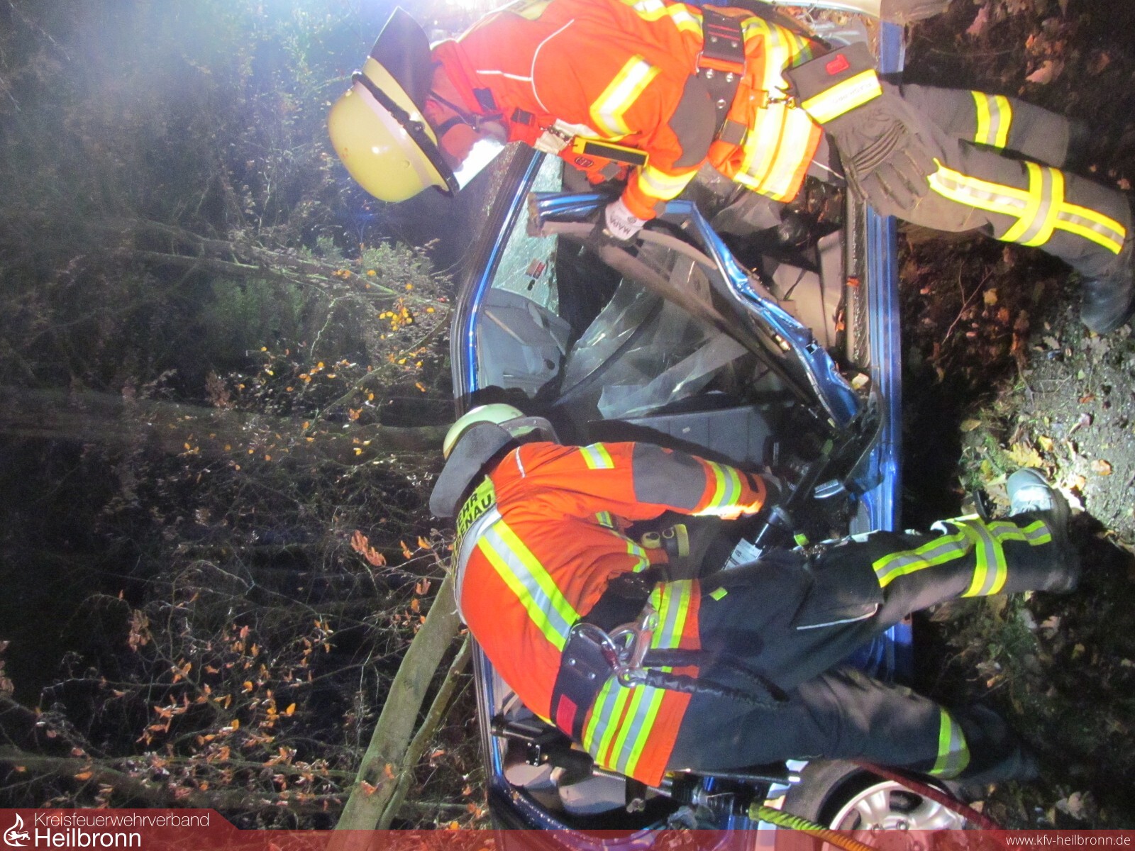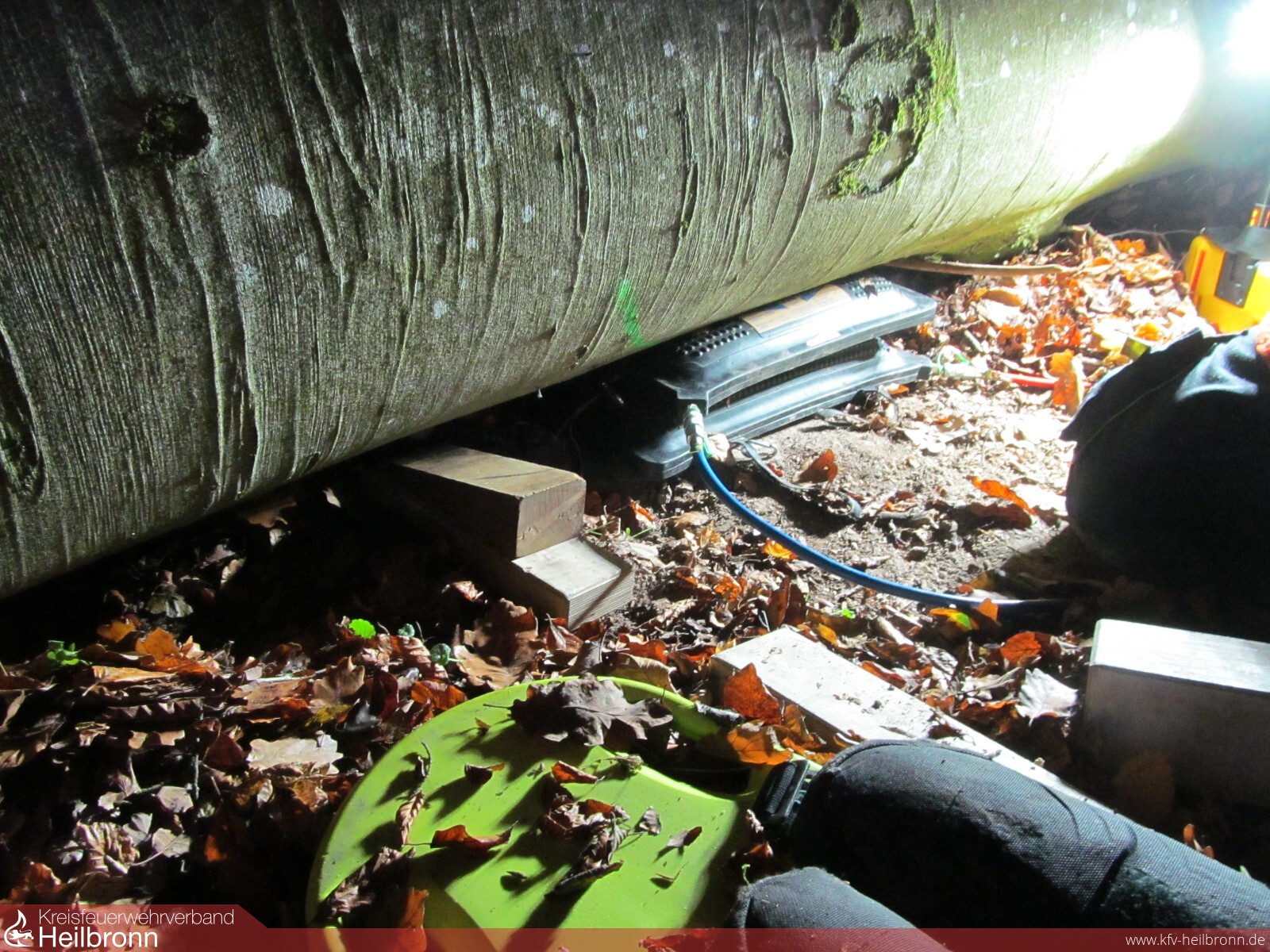 Ein Baum war bei Forstarbeiten auf ein Auto gestürzt. Der Fahrer des Fahrzeuges wurde in seinem Auto eingeklemmt, der Forstarbeiter, welcher den Baum fällte wurde unter dem Baum eingeklemmt. Vor dieses Szenario wurde die Einsatzabteilung der Freiwilligen Feuerwehr Bad Rappenau in ihrer Freitagsübung gestellt. Noch auf der Anfahrt verschärfte sich die Lage. Der PKW hatte Feuer gefangen. Der Gruppenführer des ersten Löschfahrzeuges lies deshalb seinen Angriffstrupp sofort mit Atemschutz ausrüsten. Beim Eintreffen wurde das Feuer schnell mittels Schnellangriff abgelöscht. Nun konnte die komplizierte technische Rettung beginnen. Der Fahrer war massiv eingeklemmt. Der Dummy, welcher den Forstarbeiter darstellte, war mit den Beinen unter dem Baumstamm eingeklemmt. Der Baum konnte jedoch nicht einfach angehoben werden, da sonst der Druck auf das Fahrzeug, und die darin befindende Person zunehmen würde. Deshalb wurde der Baum kurz vor dem Fahrzeug, mithilfe des Stab-Fast Systems gegen weitere Bewegungen gesichert. Auch ein Rettungszylinder wurde direkt am Baum angesetzt, um das Dach des PKWs zu entlasten. Danach wurde der Forstarbeiter mittels Hebekissen unter dem Baumstamm hervorgerettet. Anschließend wurde zur Entlastung der Baum an der vorderen Stelle durchgesägt. Danach begann die Rettung des Fahrers. Der Fahrer musste über die Beifahrerseite gerettet werden. Dort wurden beide Türen, sowie die B-Säule entfernt, um genug Platz für die Rettung zu schaffen. Anschließend wurde mithilfe eines hydraulischen Zylinders das Dach des Fahrzeuges soweit angehoben, bis der Dummy entklemmt war. Danach wurde mit einem Rettungsbrett aus dem Fahrzeug befreit. Gegen 22 Uhr war die Übung beendet. Direkt im Anschluss wurde das ganze Szenario nochmals durchgesprochen und bewertet.