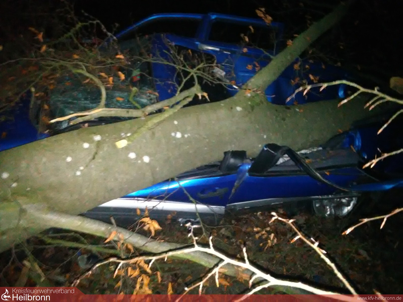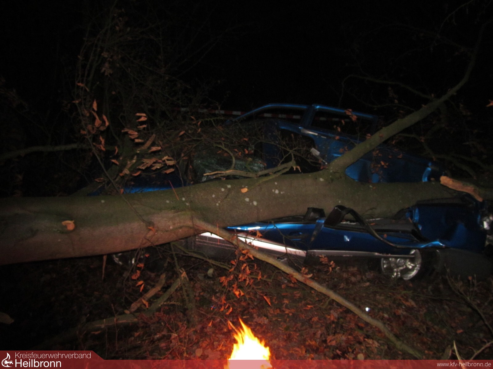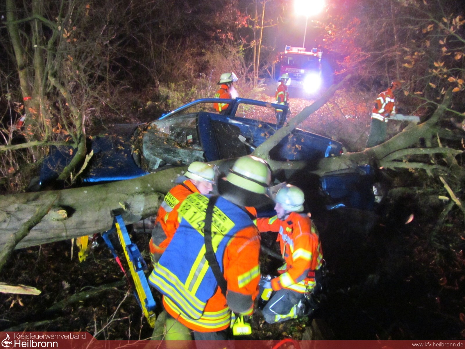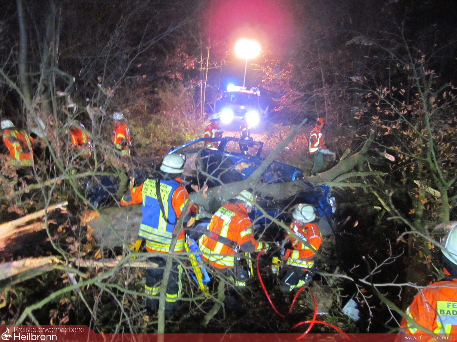 Ein Baum war bei Forstarbeiten auf ein Auto gestürzt. Der Fahrer des Fahrzeuges wurde in seinem Auto eingeklemmt, der Forstarbeiter, welcher den Baum fällte wurde unter dem Baum eingeklemmt. Vor dieses Szenario wurde die Einsatzabteilung der Freiwilligen Feuerwehr Bad Rappenau in ihrer Freitagsübung gestellt. Noch auf der Anfahrt verschärfte sich die Lage. Der PKW hatte Feuer gefangen. Der Gruppenführer des ersten Löschfahrzeuges lies deshalb seinen Angriffstrupp sofort mit Atemschutz ausrüsten. Beim Eintreffen wurde das Feuer schnell mittels Schnellangriff abgelöscht. Nun konnte die komplizierte technische Rettung beginnen. Der Fahrer war massiv eingeklemmt. Der Dummy, welcher den Forstarbeiter darstellte, war mit den Beinen unter dem Baumstamm eingeklemmt. Der Baum konnte jedoch nicht einfach angehoben werden, da sonst der Druck auf das Fahrzeug, und die darin befindende Person zunehmen würde. Deshalb wurde der Baum kurz vor dem Fahrzeug, mithilfe des Stab-Fast Systems gegen weitere Bewegungen gesichert. Auch ein Rettungszylinder wurde direkt am Baum angesetzt, um das Dach des PKWs zu entlasten. Danach wurde der Forstarbeiter mittels Hebekissen unter dem Baumstamm hervorgerettet. Anschließend wurde zur Entlastung der Baum an der vorderen Stelle durchgesägt. Danach begann die Rettung des Fahrers. Der Fahrer musste über die Beifahrerseite gerettet werden. Dort wurden beide Türen, sowie die B-Säule entfernt, um genug Platz für die Rettung zu schaffen. Anschließend wurde mithilfe eines hydraulischen Zylinders das Dach des Fahrzeuges soweit angehoben, bis der Dummy entklemmt war. Danach wurde mit einem Rettungsbrett aus dem Fahrzeug befreit. Gegen 22 Uhr war die Übung beendet. Direkt im Anschluss wurde das ganze Szenario nochmals durchgesprochen und bewertet.