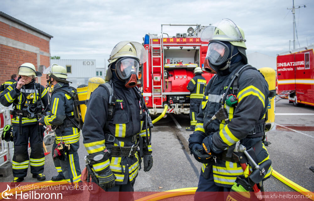 „Für uns ist es immer gut, bei einer Übung realistisch zusammenzuarbeiten“, sagt der Neckarsulmer Kommandant Wolfgang Rauh. Innerhalb von rund 20 Minuten werden acht Personen – vier Mitglieder der Jugendfeuerwehr Neckarsulm und vier Puppen – aus den Gebäuden gerettet und der Brand in der Halle bekämpft.