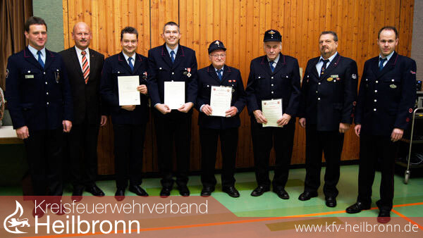 Bild 2: Ehrungen bei der Feuerwehr Güglingen: Jochen Gabriel (3.v.l.) und Bernd Hees (4.v.l.) wurden für 25-jährigen aktiven Dienst mit dem Feuerwehr-Ehrenzeichen in Silber ausgezeichnet. Helmut Conz(5.v.l.) wurde für 60-jährige Mitgliedschaft geehrt, Hermann Küstner (3.v.r.) für 50-jährige Mitgliedschaft. Karl-Heinz Hentschke (50 Jahre Mitglied) erhält seine Ehrenurkunde, wenn er wieder gesund ist. (rob/Foto: Baumann)