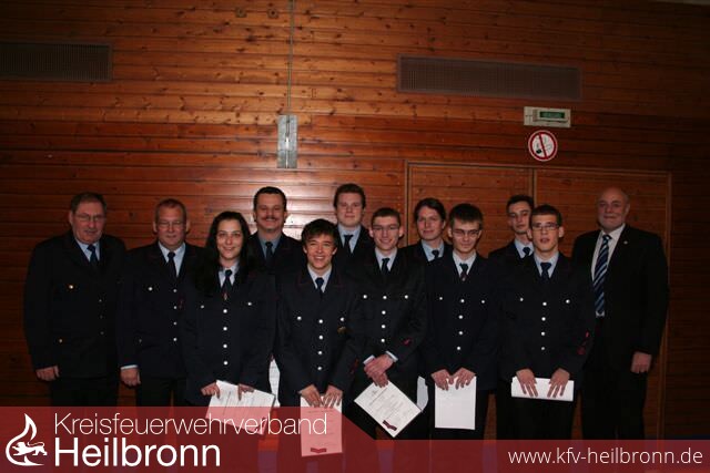 Bei der Hauptversammlung der Freiw. Feuerwehr Oedheim beglückwünschen der Stv. Kreisbrandmeister Hermann Jochim, Kommandant Franz Schuster (v. Li.) sowie Bürgermeister Ulrich Ruoff (re.) die beförderten bzw. verpflichteten FeuerkameradInnen Stefanie Marche, Winko Klinar, Christian Bender, Patrick Fiedler, Jan Herold, Mikel Bauer, Stephen Funk, Marcel Glaser und Florian Burkart (v.li.).