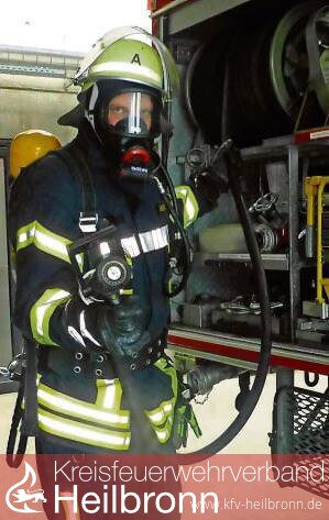 Bild: Keine Angst, er will nur helfen: Gut ausgerüstet fahren die Feuerwehrmänner zu ihren Einsätzen. (Foto: Ulrike Kieser-Hess)