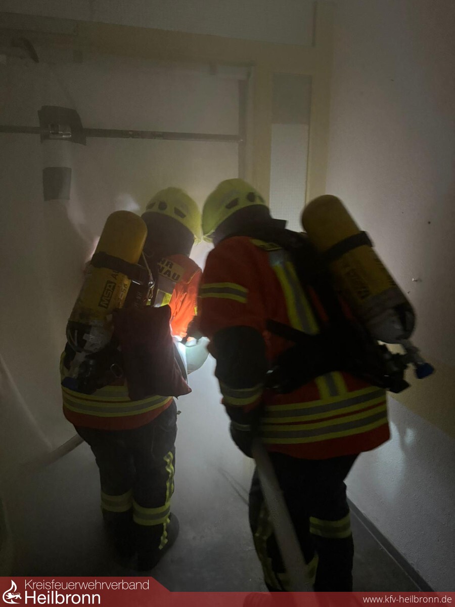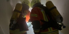 Der Gruppenführer des ersten Löschfahrzeugs reagierte sofort: Ein Trupp unter Pressluftatmer ging zur Menschenrettung vor. Parallel dazu baute der Wassertrupp eine Riegelstellung auf, um ein Übergreifen des Feuers auf andere Gebäudeteile zu verhindern.
