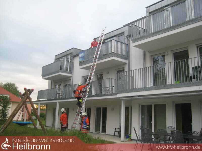 Angenommen wurde ein Brand im Waschraum, der in kürzester Zeit das Treppenhaus verrauchte und damit eine Flucht aus den Obergeschossen des Gebäudes unmöglich machte. Das Übungsdrehbuch sah vor, dass sich die im Erdgeschoss befindlichen Personen über die Terrassen sicher retten konnten. 8 Personen in den Obergeschossen standen jedoch hilferufend auf 3 verschiedenen Balkonen.
