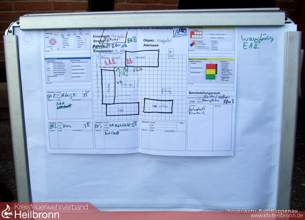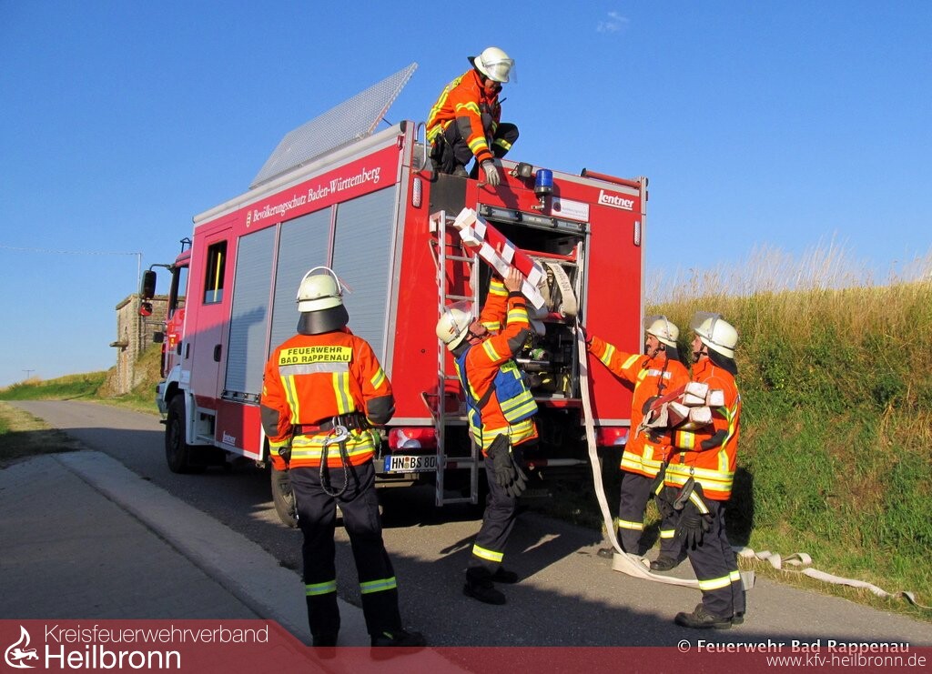 Dem angenommenen Brand in einem Nebengebäude rückten die Wehren aus Neckarbischofsheim, Untergimpern und Babstadt zu Leibe. Die Löschwasserbereitstellung gewährleistete der Wasserförderungszug mit einer 1665 Meter langen Schlauchleitung und fünf Verstärkerpumpen. Gleichzeitig nutzte die Unterkreisführungsgruppe Waibstadt (Rhein-Neckar-Kreis) das Szenario für eine Übungseinheit und unterstützte die örtliche Einsatzleitung, die in diesem Fall - auch außergewöhnlich - bei der Feuerwehr Neckarbischofsheim lag. Bei tatsächlichen Einsätzen fiele der Unterbiegelhof in den Verantwortungsbereich der Feuerwehr Bad Rappenau und deren Führungskräfte. In dieser Übung lagen die Prioritäten allerdings bei der Wasserversorgung und der Kommunikation der Wehren über die Kreisgrenzen hinweg. 1975 war der Geflügelhof Funck von einem Großbrand heimgesucht worden, bei dem tausende Legehennen den Tod fanden.