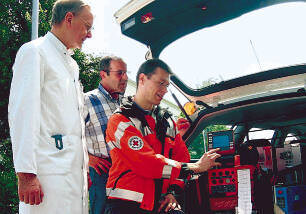Bild: Joachim Cyran (links) und Lothar Reinhard von der DRK-Rettungsleitstelle sehen Internist und Notarzt Urs Riemann zu, wie er die EKG-Daten verschickt. (Foto: Bauer)
