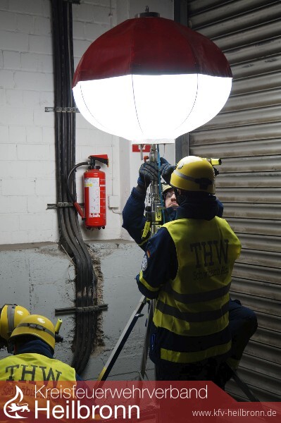 Als die ersten Helfer eintrafen, stellten diese eine ausreichende Beleuchtung des Außenbereiches sicher. Zeitgleich wurde ein Trupp zur Erkundung in das Gebäude geschickt. Da im oberen Teil des Gebäudes noch Personen vermutet wurden, suchte dieser Trupp zugleich nach einer geeigneten Stelle, um diese zu retten. Da das Treppenhaus eingestürzt war, mussten sich Helfer den Weg durch den Kühlbereich in das 1. Obergeschoss bahnen. Dazu wurden der Weg und der Arbeitsbereich mit Hilfe von Strahlern ausgeleuchtet.