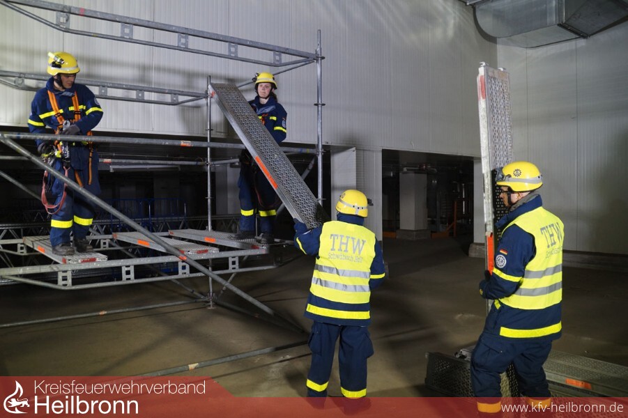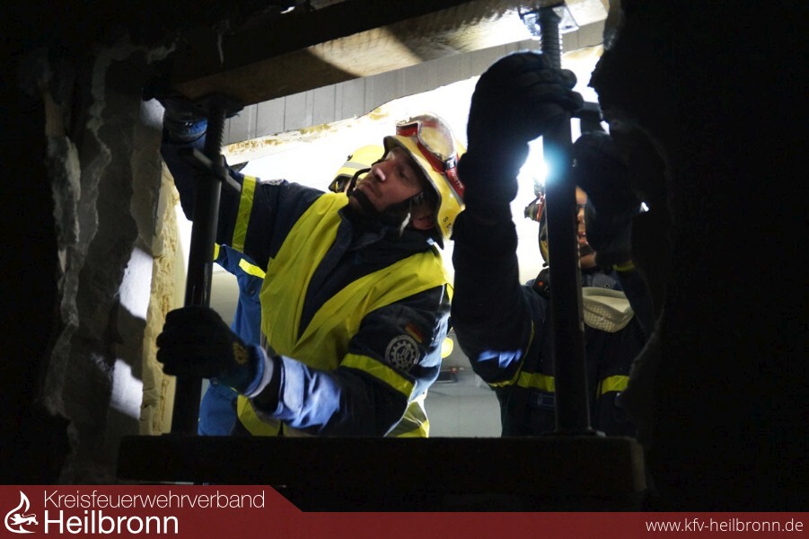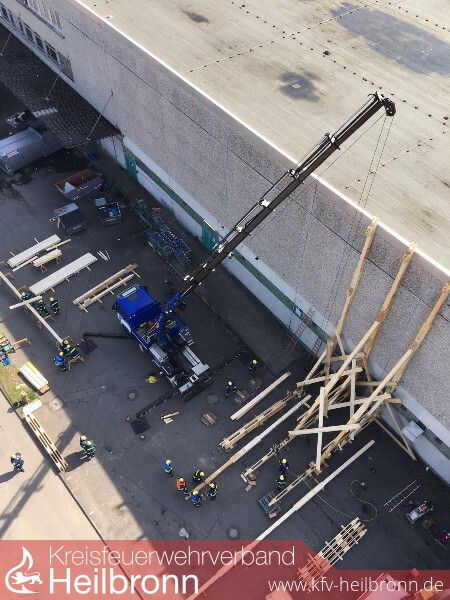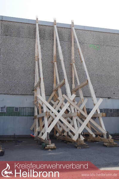 Zur selben Zeit wurde durch den THW Ortsverband Widdern, mit Unterstützung des Ortsverbandes Pfedelbach und der Feuerwehr Weinsberg, die andere Gebäudeseite abgestützt. Dazu kam das sogenannte Abstützsystem Holz (ASH) zum Einsatz, das im OV Widdern stationiert ist. Aufgebaut wurde der sogenannte Stützbock, der bis zu 15 Meter in die Höhe reichen kann. Er besteht aus Bohlentreibladen, also Balken, die auf dem Boden liegen. Auf ihnen werden senkrecht stehende Streichbalken befestigt, es entsteht ein rechter Winkel. Um die Konstruktion zu stabilisieren, befestigen die Helferinnen und Helfer diagonal, zwischen Bohlentreibladen und Streichbalken, sogenannte Strebstützen, was dem Ganzen das Aussehen eines Dreiecks verleiht.