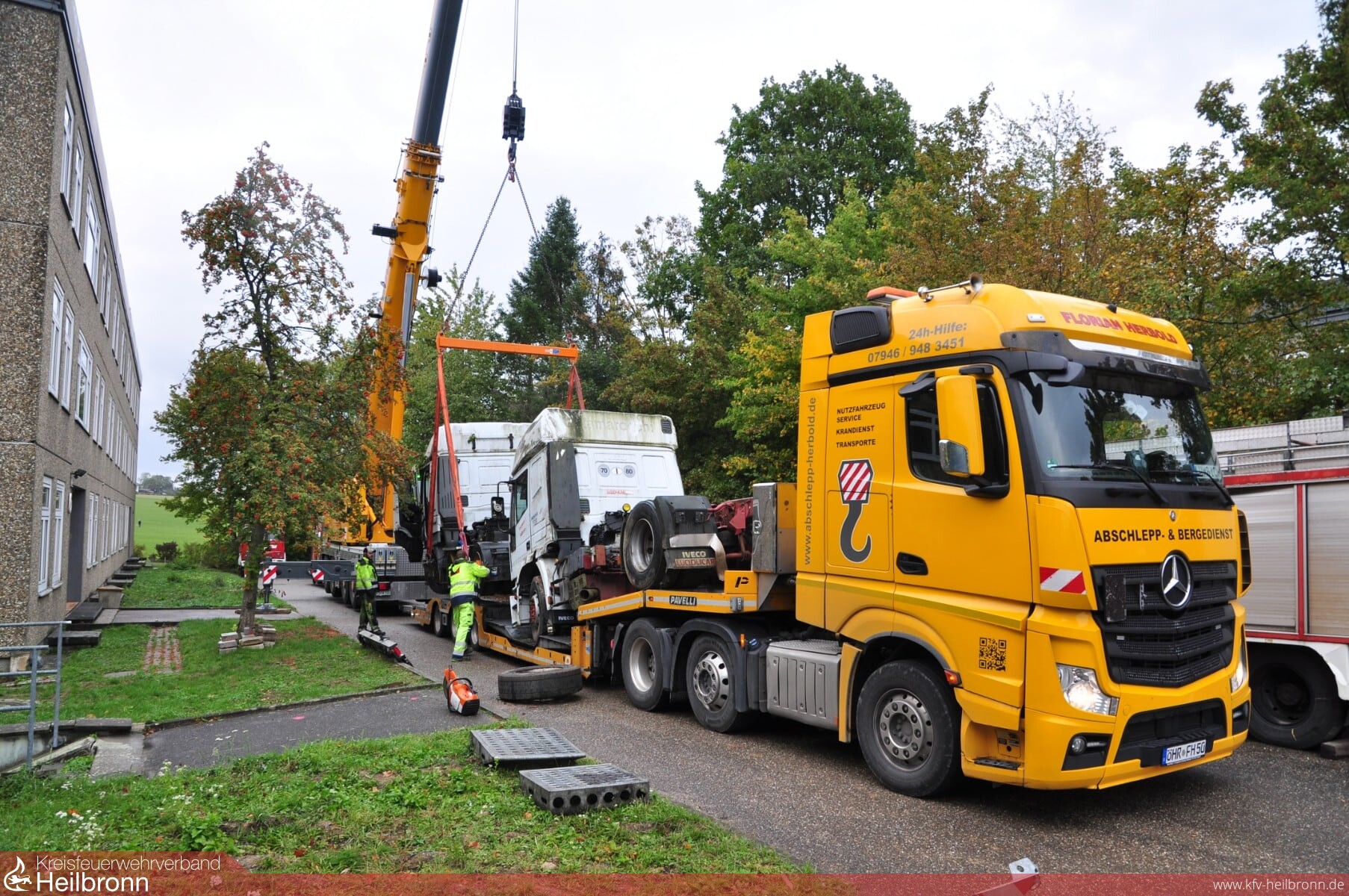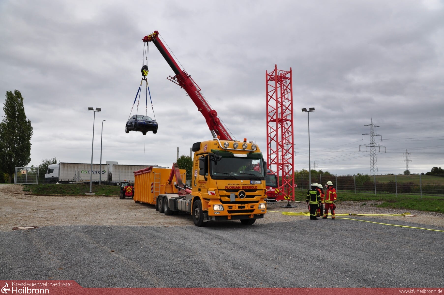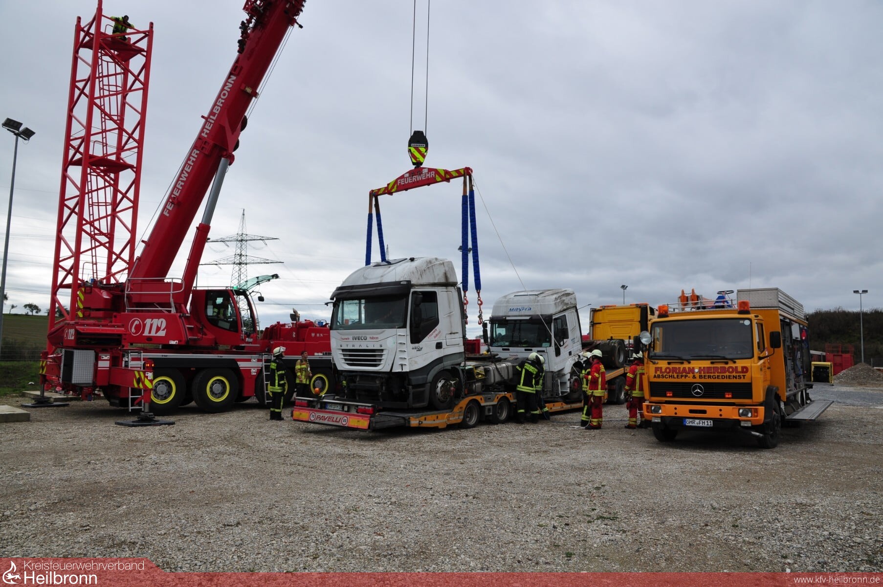 Zur Erweiterung der Aus- und Fortbildungsmöglichkeiten auf dem Feuerwehrübungsgelände wurden die bisher beim Trainingscenter Retten und Helfen (TCRH) in Mosbach vorgehaltenen Sattelzugmaschinen nach Heilbronn umgestellt. Da es sich hierbei um eine logistisch sehr aufwendige Aktion handelte, bekam die Feuerwehr tatkräftige Unterstützung von einem regionalen Abschlepp- und Bergeunternehmen. Natürlich wurde diese Gelegenheit auch gleichzeitig genutzt um einen Erfahrungsaustausch zwischen den Mitarbeitern des Unternehmens sowie den Teilnehmer des Laufbahnlehrganges der Berufsfeuerwehr zu realisieren. Schwerpunkte dieser gemeinsamen Ausbildung waren die Anwendung ähnlicher technischer Gerätschaften sowie das reibungslose Zusammenspiel zwischen der Feuerwehr und dem Bergeunternehmen. Auch verschiedene Übungen wie das sichere Anschlagen und Anheben von schweren Fahrzeugen standen hierbei im Focus.