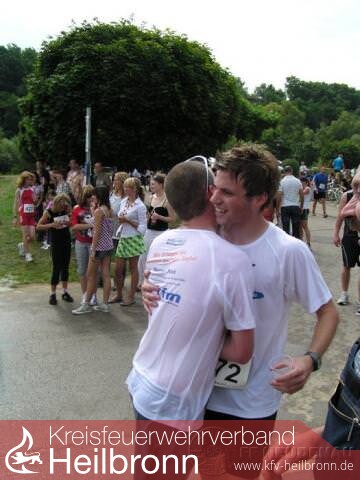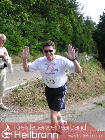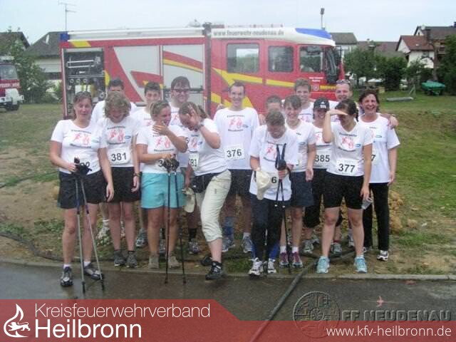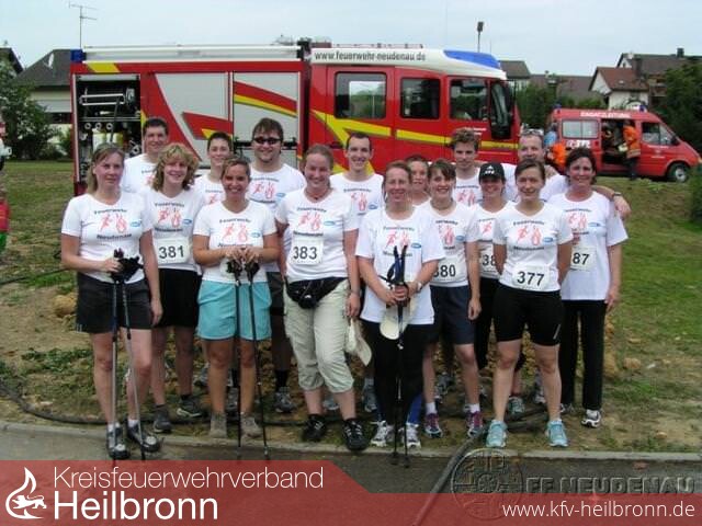 Beim diesjährigen Gänslauf war die Freiwillige Feuerwehr Neudenau nicht nur durch Sicherungsposten auf der kompletten Strecke vertreten, sondern auch durch sage und schreibe 16 Personen, die aktiv am Lauf teilnahmen.In den Wochen zuvor traf man sich mindestens einmal die Woche zum gemeinsamen Lauftraining auf der Strecke sowie zu weiteren Trainingsprogrammen. Am Vorabend des Laufs bekochten die beiden Trainer nochmals die 16 Teilnehmer, eine „Nudelparty" gehört doch zu jedem guten Volkslauf dazu...So begab man sich bei sonnigem Wetter (fast zuviel Sonne) und hohen Temperaturen am Sonntagmorgen nach Herbolzheim; um 10.03 Uhr erfolgte der Startschuss...Über den Radweg ging es in Richtung Neudenau, dort vorbei an der Heilig-Kreuz-Kapelle, dann wieder in Richtung Herbolzheim, die alte Allfelder Steige hinauf, über Lindach und Käpelle zurück nach Herbolzheim.Bei knapp 30° Celsius überlegte sich manch Teilnehmer unterwegs, ob er nicht aufgeben sollte. Dies geschah aber nicht - alle Läufer der Feuerwehr Neudenau erreichten das Ziel!