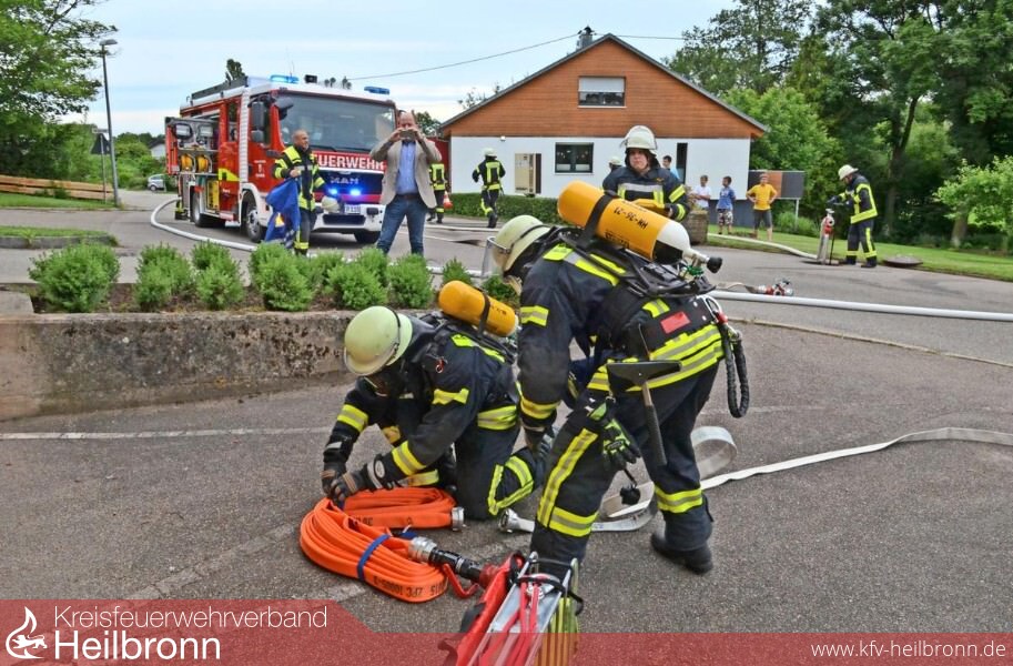 So realitätsnah wie möglich soll der Einsatz sein, sagt Kommandant Matthias Fried. Weder Tag noch Stunde sei vorher bekannt gegeben worden. Pünktlich, wie mit der Leitstelle in Heilbronn vereinbart, heulen um 19.10 Uhr die Feuersirenen in Pfaffenhofen und Weiler los, und die Funkmeldeempfänger der Einsatzkräfte melden sich mit dem entsprechenden Einsatztext. Zwölf Minuten später ist die Feuerwehr einsatzbereit vor Ort. Feuer in der Talstraße 2 wird gemeldet.