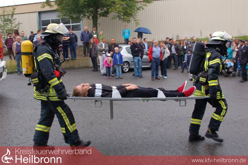 Einmal jährlich ist eine Hauptübung. Unter dem Jahr absolvieren die einzelnen Gruppen ihre eigenen Übungen, einmal monatlich trifft sich die ganze Wehr. „Die Hauptübung ist für die Bevölkerung und soll die Leistungsfähigkeit der Wehr zeigen“, erklärt Pressesprecher Michael Kenngott. „Aber es ist natürlich auch für uns gut, denn wenn wir die Gebäude kennen, tun wir uns im Ernstfall leichter mit der Orientierung.“ Die Kelter zum Beispiel hat so viele Kellergeschosse, dass man sich darin leicht verlaufen könnte. Um 16.28 Uhr erklärt Einsatzleiter Andreas Löffler unter dem Applaus der Schaulustigen die Übung, die auch Bürgermeister Klaus-Peter Waldenberger beobachtet hat, für beendet. Die Verletzten erfahren eine Spontanheilung und es geht ans Aufräumen.