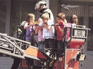 Besonders beeindruckend war die Rettung über die Drehleiter, wo mehrere Kinder im Korb nach unten fahren durften. Während die Rettungsaktion im Gange war, mussten einige Feuerwehrleute die verrauchte Schule nach "bewusstlosen Opfern" durchsuchen und brachten schließlich unter großem Hallo die "lila Puppe" auf einer Trage heraus.
