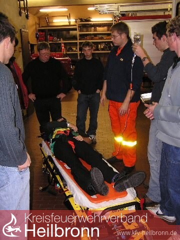 Der Kurs wurde von Herrn Roland Schmitt vom Arbeiter Samariter Bund Heilbronn durchgeführt und umfasste insgesamt 16 Unterrichtsstunden. Um den besonderen Anforderungen der verschiedenen Einsatzszenarien, auf die unsere Wehr vorbereitet sein sollte, gerecht werden zu können, wurde neben den üblichen Lehrinhalten eines solchen Kurses noch das Modul ?Retten? angeboten. Um hier möglichst realistisch üben zu können, stellte der ASB an einem Übungstag, neben insgesamt 5 Ausbildern, noch einen kompletten Rettungswagen bei.
