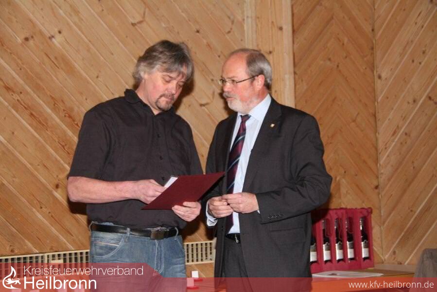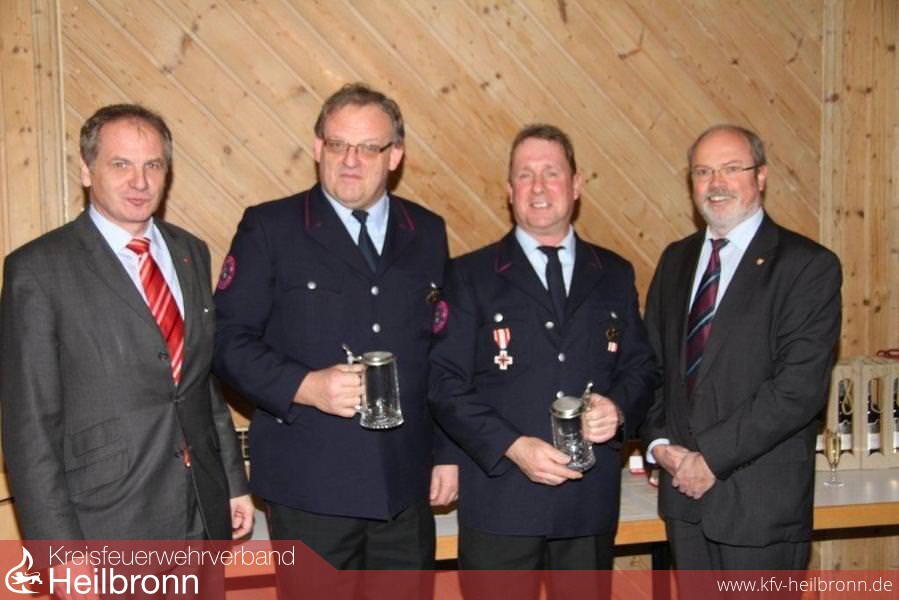 Innenminister Reinhold Gall übernahm gemeinsam mit Bürgermeister Olma die Ehrungen der langjährigen Mitglieder. Wolfgang Schlägel erhielt eine Auszeichnung für 40 Jahre und Jochen Thiede für 25 Jahr im Dienst der Feuerwehr. Da aber beide entschuldigt waren, wird diese Ehrung in einem angemessenen Rahmen nachgeholt. Von der Abteilung Unterkessach wurden Erich Herrmann und Harald Frank für 30 Jahre geehrt und erhielten den gravierten Ehrenkrug.
