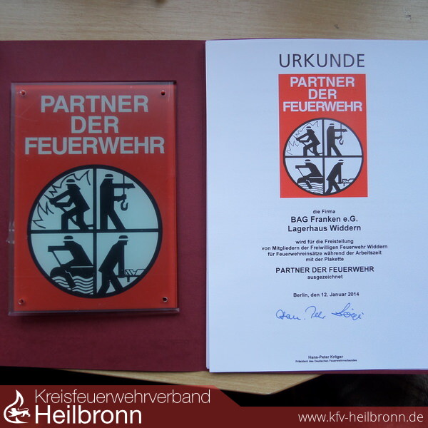 Und genau solch ein Betrieb ist die BAG Franken e.G mit Geschäftsführer Bernhard Jochim. Aus diesem Grund nahm Bürgermeister Olma den Bürgerempfang 2014 zum Anlass, um der BAG Franken e.G, die Auszeichnung als „Partner der Feuerwehr“ zu verleihen. Er überreichte die Urkunde und das Förderschild an Klaus Ehrhardt, der nicht nur bei einem Einsatz sofort zur Stelle ist, sondern auch noch im Besitz eines LKW Führerscheins ist. Somit leistet er einen wertvollen Beitrag zur Einsatzbereitschaft der Feuerwehr Widdern.
