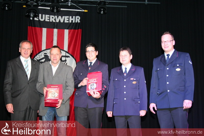 Als „Partner der Feuerwehr“ zeichnet Innenminister Reinhold Gall (li.) die Fa. Elektro-Marche und Fa. IFC GmbH aus Oedheim aus. Bernhard Marche und Matthias Kirner nehmen die Plakette entgegen, während Kommandant Sven Kübler (re.) und Stellvertreter Bernd Ehrhardt (2. v. re.) für die Feuerwehr Oedheim gratulieren.