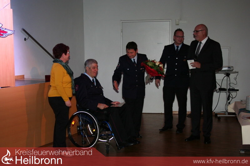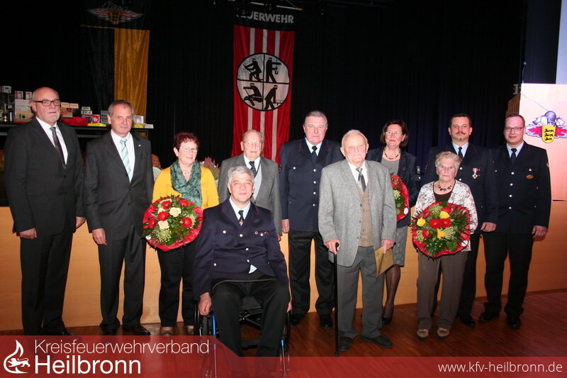 Bürgermeister Ulrich Ruoff und Kommandant Sven Kübler zeichneten beim Kameradschaftsabend der Freiw. Feuerwehr Oedheim Vinzenz, gen. Winko Klinar für 25 Jahre aktive Dienstzeit mit dem Feuerwehr-Ehrenzeichen in Silber des Landes Baden-Württemberg aus. Nach einem schweren Verkehrsunfall 1983 bei der Feuerwehr ist Axel Amlung an den Rollstuhl gebunden, trotzdem versieht er als Mitglied der Altersabteilung regelmäßig bei Einsätzen und Übungen Feuerwehrdienst am Funk. Für dieses, auch von Reinhold Gall als großes Vorbild bezeichnete Engagement trotz des Schicksalsschlags, wurde Axel Amlung für 40 Jahre Mitgliedschaft bei den Feuerwehren in Launsbach (Nordhessen) und Oedheim geehrt. Der frühere Kommandant (1971 – 1977) und langjährige Zugführer Reinhold Denzer konnte für 50 Jahre Mitgliedschaft bei der Freiw. Feuerwehr in Oedheim ausgezeichnet werden. Erfreulicherweise für 60 Jahre als Mitglied wurde Otto Bauer geehrt. Gleich zwei Kameraden der Altersabteilung traten bereits 1944 in die Feuerwehr ein und blicken nun auf imposante 70 Jahre Mitgliedschaft zurück. Hermann Weber, langjähriges Ausschussmitglied, Kassier und Schriftführer der Wehr, konnte seine Ehrung persönlich in Empfang nehmen. Gebhard Keicher, langjähriger Zugführer, wird die Ehrung bei einem Besuch überreicht. Bürgermeister Ruoff, Kommandant Kübler und Innenminister Reinhold Gall gratulierten den geehrten Kameraden und freuten sich über das gute Miteinander in den Reihen der Oedheimer Feuerwehr.