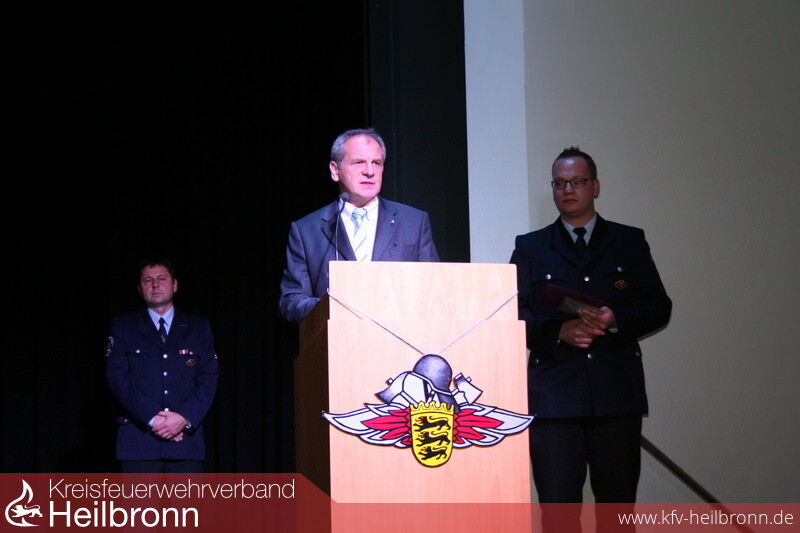 Reinhold Gall, der Vorsitzende des Kreisfeuerwehrverbandes und als Innenminister der oberste Verantwortliche für die Feuerwehren, fand lobende Worte für das Engagement und die Verantwortung, die Feuerwehrleute für die Gesellschaft übernehmen. Er freute sich über die große Jugendfeuerwehr, die das wichtigste Instrument für die Nachwuchswerbung ist, trotz der erfreulichen Zahl von Seiteneinsteigern in Oedheim 2014. „Ohne uns wird?s brenzlig“, ein alter Wahlspruch der Feuerwehr, unterstreicht die Wichtigkeit und rechtfertigt die hohen finanziellen Investitionen der Gemeinde in ihre Feuerwehr. Dies erfordert aber auch das Verständnis von Arbeitgebern, dass Mitarbeiter während der Arbeitszeit zur Stärkung der Tagesverfügbarkeit bei Alarm zum Einsatz ausrücken können.