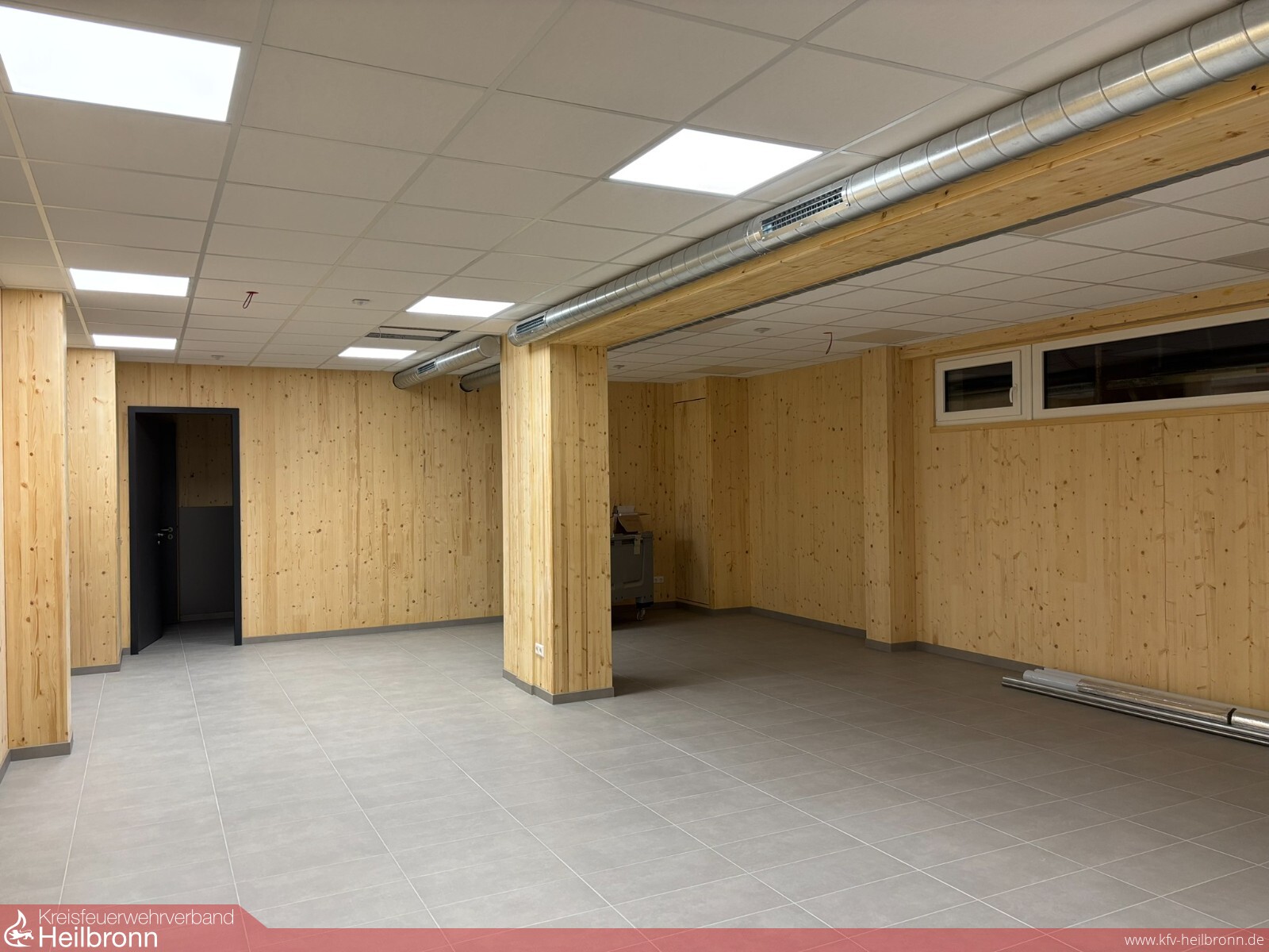 Im Bestandsgebäude wurden umfangreiche Bodenarbeiten in der gesamten Fahrzeughalle und dem ehemaligen Unterrichtsraum durchgeführt: Der Boden wurde zunächst komplett abgeschliffen, um anschließend eine („rutschfeste“) Beschichtung aufzutragen.