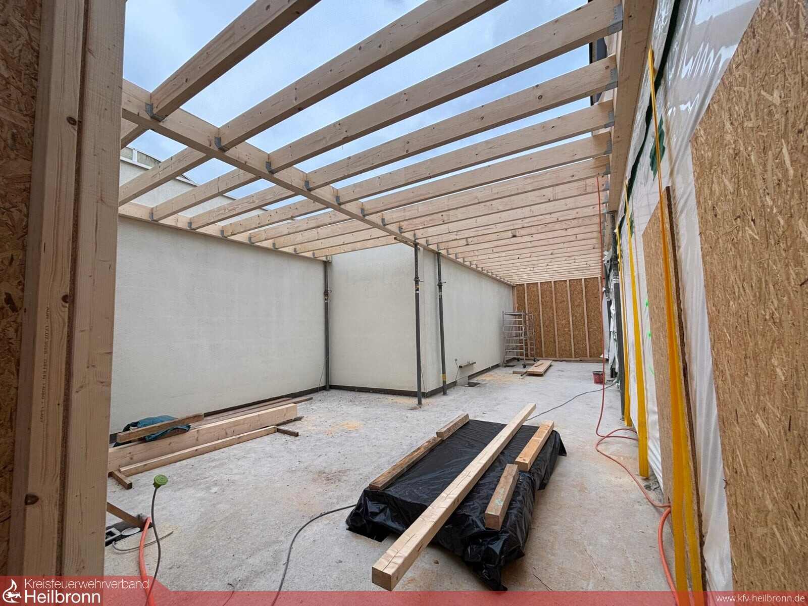 Im Bestandsgebäude werden mehrere Durchbrüche vorgenommen. Einmal zwischen der bestehenden Fahrzeughalle und dem bestehenden Unterrichtsraum, um die Fahrzeughalle seitlich zu vergrößern. Außerdem nach hinten in Richtung des neuen Anbaus. Zusätzlich wird das Bestandsgebäude saniert.