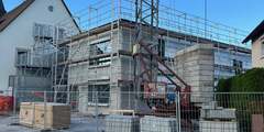Der nächste Meilenstein folgte am 11.09.2025, als der Anbau an nur einem einzigen Tag nahezu vollständig errichtet wurde. Bei der Errichtung des Anbaus hat man sich für eine sogenannte Modulbauweise entschieden: Insgesamt acht Module aus Holz wurden durch die Baufirma vorab gefertigt, um anschließend auf der Bodenplatte in Obereisesheim zu einem Gebäude zusammengesetzt zu werden. Im Zeitraum zwischen dem 16.09.2025 bis 20.09.2025 wurden weitere Fertigbauteile aus Beton, wie beispielsweise die Wände für den Eingangsbereich und die Treppe angeliefert.