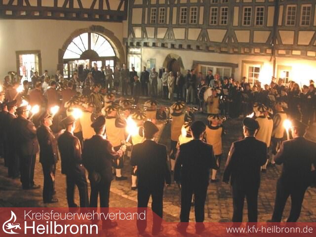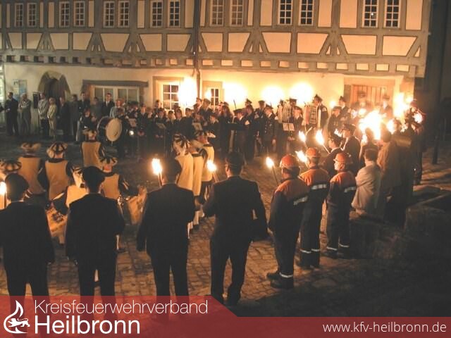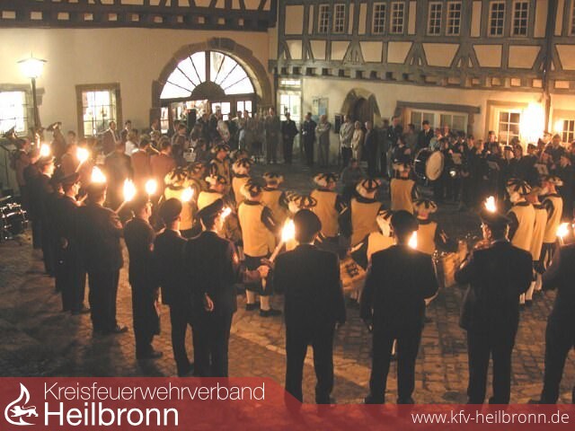 Die Freiwillige Feuerwehr Bad Wimpfen, Mitglieder des Verbandsausschusses und Kommandanten benachbarter Feuerwehren begleiten den Fanfarenzug und die Spielmannszüge der Feuerwehren vom Feuerwehrgerätehaus mit brennenden Fackeln durch die engen Gässchen der Altstadt zum alten Spital.