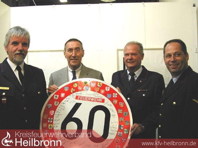 Keine Tempobegrenzung stellt das von Kreisbrandmeister Hans-Wilhelm Hansmann überreichte Schild dar - 46 Wappen der Landkreisfeuerwehren zieren mit den Unterschriften der Kommandanten das Schild.