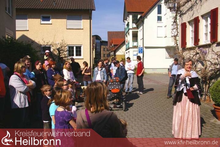 Vom Feuerwehrhaus ging es zur alten Stadtkelter. Nach einem Zeitsprung zurück in Jahr 18. Jahrhundert wurden wir von Wiltrudis, der Frau des Stadschreibers in Empfang genommen: