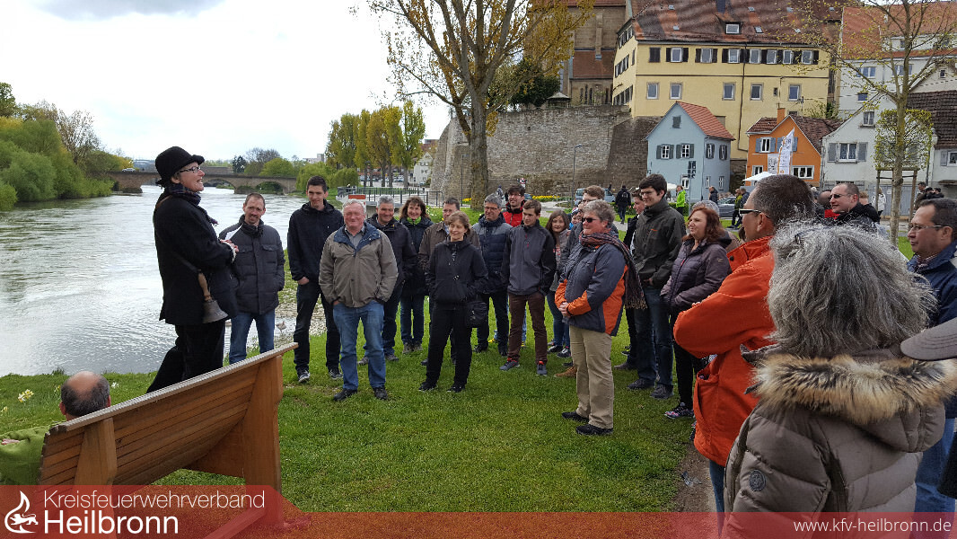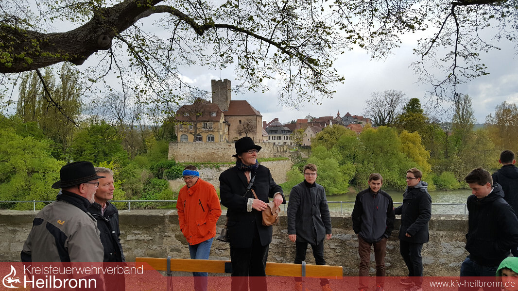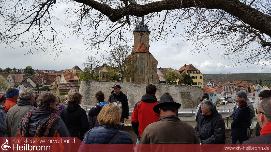 Nach einem leckeren Frühstücksbuffet ging es dann mit den beiden Stadtführern Klaus Koch und Andrea Täschner alias „Stadtbüttel Hillers Loui“ zu Fuß auf die Erkundungsreise zu den Sehenswürdigkeiten und in die Geschichte der Stadt Lauffen. Der Weg führte die beiden Gruppen in das Dorf mit dem Stadtgraben und den Kellern, der Regiswindigkirche und dann über die Rathausburg auf der Nachtigalleninsel in das historische Städtle mit dem alten Gefängnis, dem Alten Heilbronner Tor und dem Neuen Heilbronner Tor, welches noch mit seiner rund 15 Meter starken Stadtmauer bewohnt wird. Hier einen besonderen Dank an Herrn Däuble, welcher der Feuerwehr einen Einlass in seine Wohnräume und den wunderbaren Garten auf der Stadtmauer gewährt hat. Neben dem berühmten Friedrich Hölderlin, der in Lauffen geboren ist, kann Lauffen auch auf weitere Personen mit geschichtlichem Hintergrund stolz zurückblicken. So ist z.B. Oskar von Miller zu nennen, welcher im Jahr 1891 anlässlich der Internationalen Elektrotechnischen Ausstellung in Frankfurt die erste Drehstromübtragung über lange Strecken, von Lauffen am Neckar nach Frankfurt durchführte.