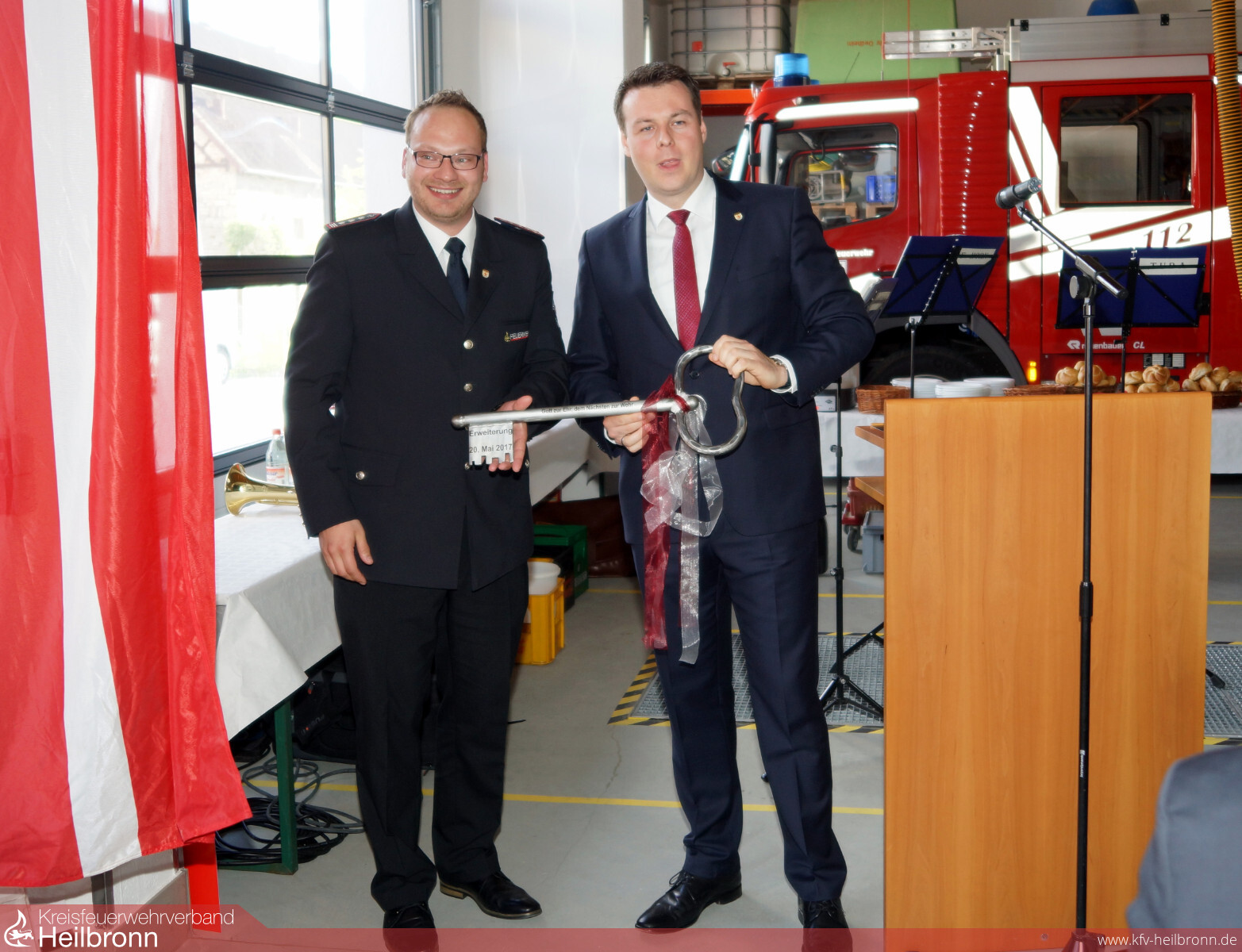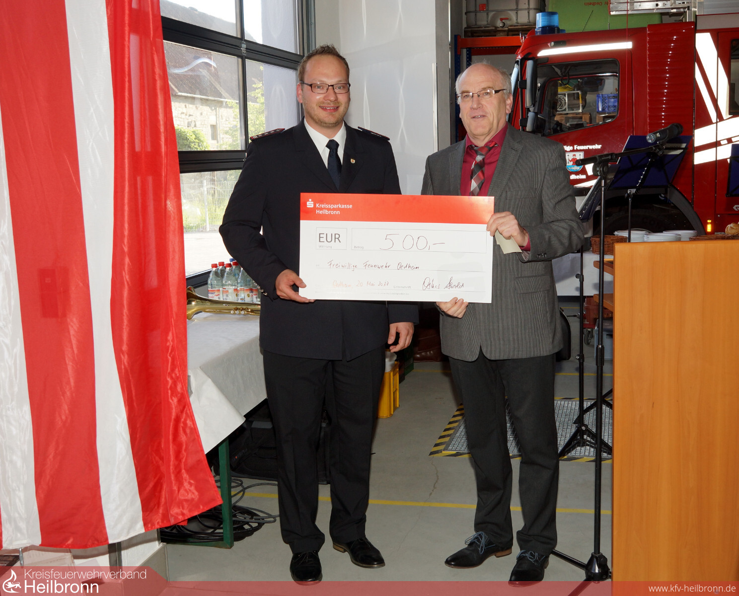 Die weiteren Geschenke und Spenden von der Kreissparkasse Heilbronn, überreicht durch Filialleiter Oskar Herold, Architekt Siegfried Kienle und der nagelneue Grill von der Fa. Osmanaj sorgten für gute Laune bei den Feuerwehrleuten, so dass der anschließende gemütliche Teil der Einweihung im neuen Feuerwehrhaus noch einige Zeit dauerte.