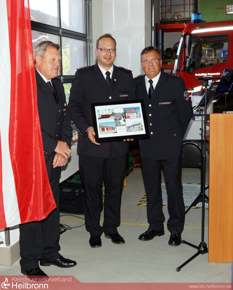 Die Kameraden der Altersabteilung haben auf einem Bild die bisherigen Standorte der Feuerwehr in Oedheim und Degmarn zusammengestellt. Gerhard Leitz und Josef Denzer konnten diese Kollage an Sven Kübler überreichen.