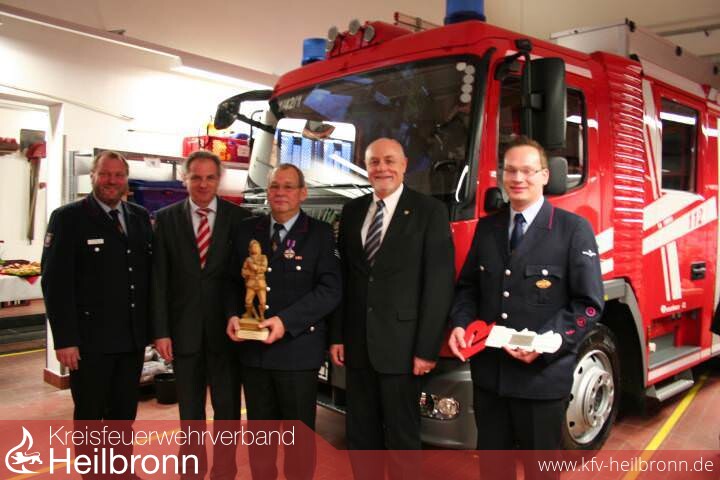 Sven Kübler, der junge Nachfolger als Kommandant der Oedheimer Wehr, dankte der Gemeinde für die Anschaffung des für alle Arten von Einsätzen geeigneten HLF und bestätigte, dass die Feuerwehr Oedheim mit der Abteilung Degmarn einen technisch sehr gut ausgestattenen Fuhrpark besitzt, um der Bevölkerung den bestmöglichen Schutz zu gewähren. Auch er würdigte die Verdienste seines scheidenden Vorgängers, sprach die wichtigsten Entscheidungen wie die Anschaffung des TLF 16/25 2002, des ELW 2007, die Wiedergründung der Jugendfeuerwehr 2002 und nun die Beschaffung des HLF an und dankte ihm persönlich für die gute Vorbereitung für seine neue Aufgabe als Kommandant. Zusammen mit dem Stv. Kommandant Bernd Ehrhardt überreichte er Franz Schuster das Geschenk der Feuerwehrkameraden, einen geschnitzten Feuerwehrmann aus Tirol.
