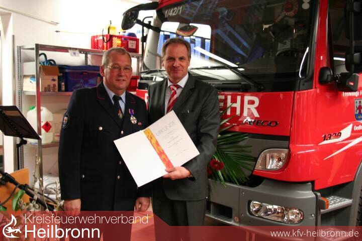 Reinhold Gall, Vorsitzender des KFV Heilbronn und als Innenminister von Baden-Württemberg zugleich oberster Vorgesetzter der Feuerwehren, betonte, dass der heutige ein guter Tag für die Gemeinde Oedheim und ihre Bürger ist und dass sich das tolle HLF auf jeden Fall sehen lassen kann, obwohl die Entscheidung in finanziell schwieriger Zeit getroffen wurde. Mit Franz Schuster verabschiedet er einen alten Haudegen im positiven Sinne, der Kommandant der Feuerwehr ist ja nach dem Bürgermeister der zweitwichtigste Mann im Ort. Viel Beifall gab es, als er Franz Schuster zur Überraschung aller mit dem Deutschen Feuerwehr-Ehrenkreuz in Silber, eine der höchsten Auszeichnungen im Feuerwehrwesen bundesweit, auszeichnen konnte.