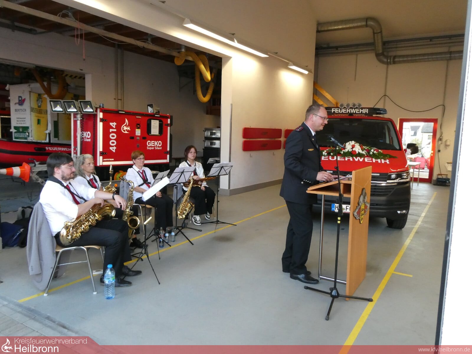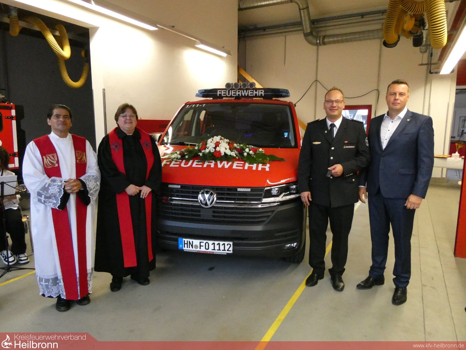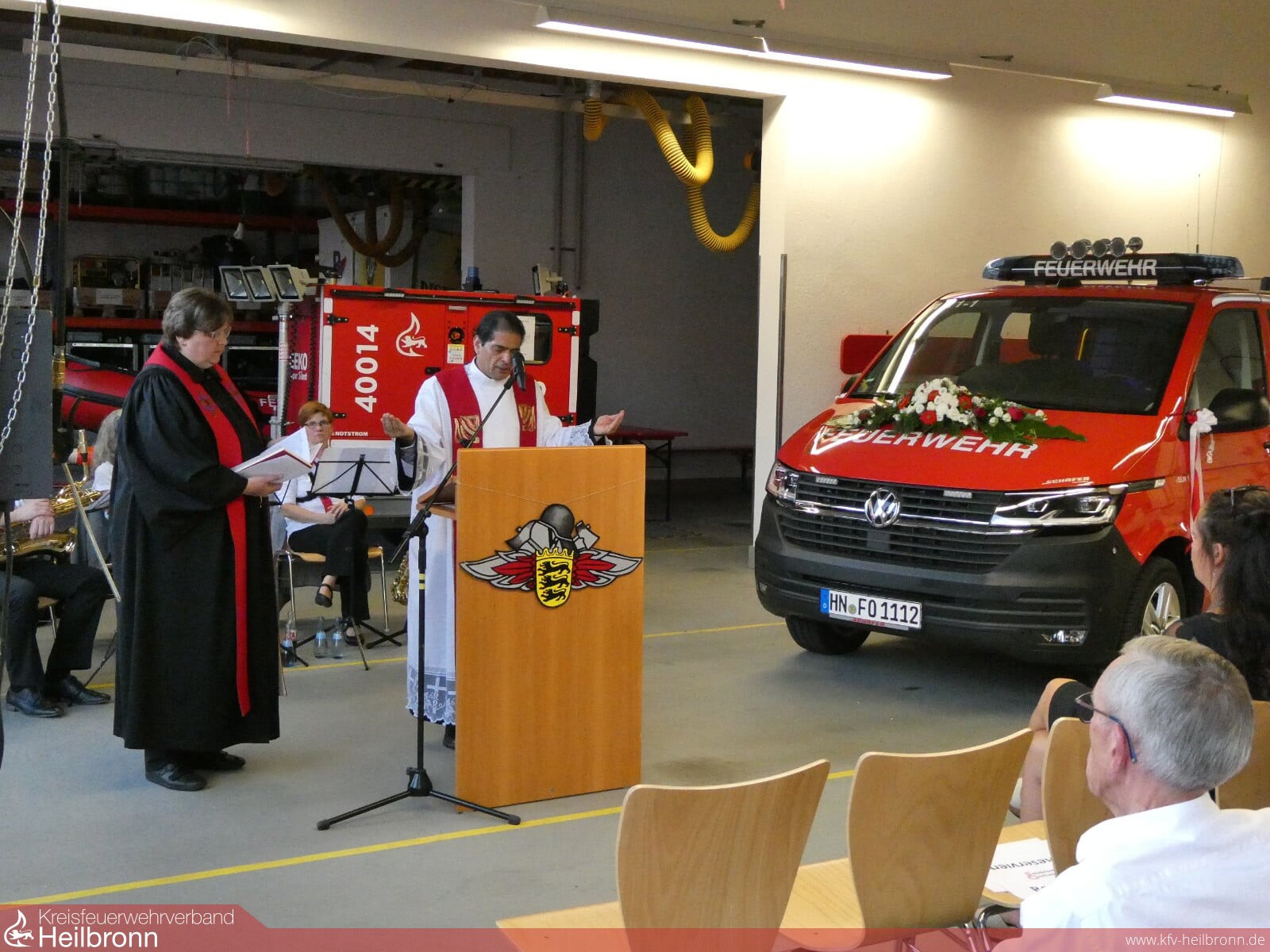 Bei der feierlichen Fahrzeugübergabe konnte Bürgermeister Matthias Schmitt im Oedheimer Feuerwehrhaus den Schlüssel für den neuen Einsatzleitwagen ELW an Kommandant Sven Kübler und die Oedheimer Feuerwehr überreichen. Die Oedheimer Ortsgeistlichen, Pfarrerin Brigitte Strobel und Pfarrer Johny Joseph, übernahmen mit ergreifenden Worten die Segnung und Weihe des festlich geschmückten neuen Führungsfahrzeugs und baten in den Fürbitten für den Schutz der Oedheimer Feuerwehr und den Kameraden und Kameradinnen bei der Arbeit und den Einsätzen. Auch die musikalische Begleitung durch das Saxofon-Ensemble des Musikvereins gab der Feierlichkeit einen beeindruckenden Rahmen.