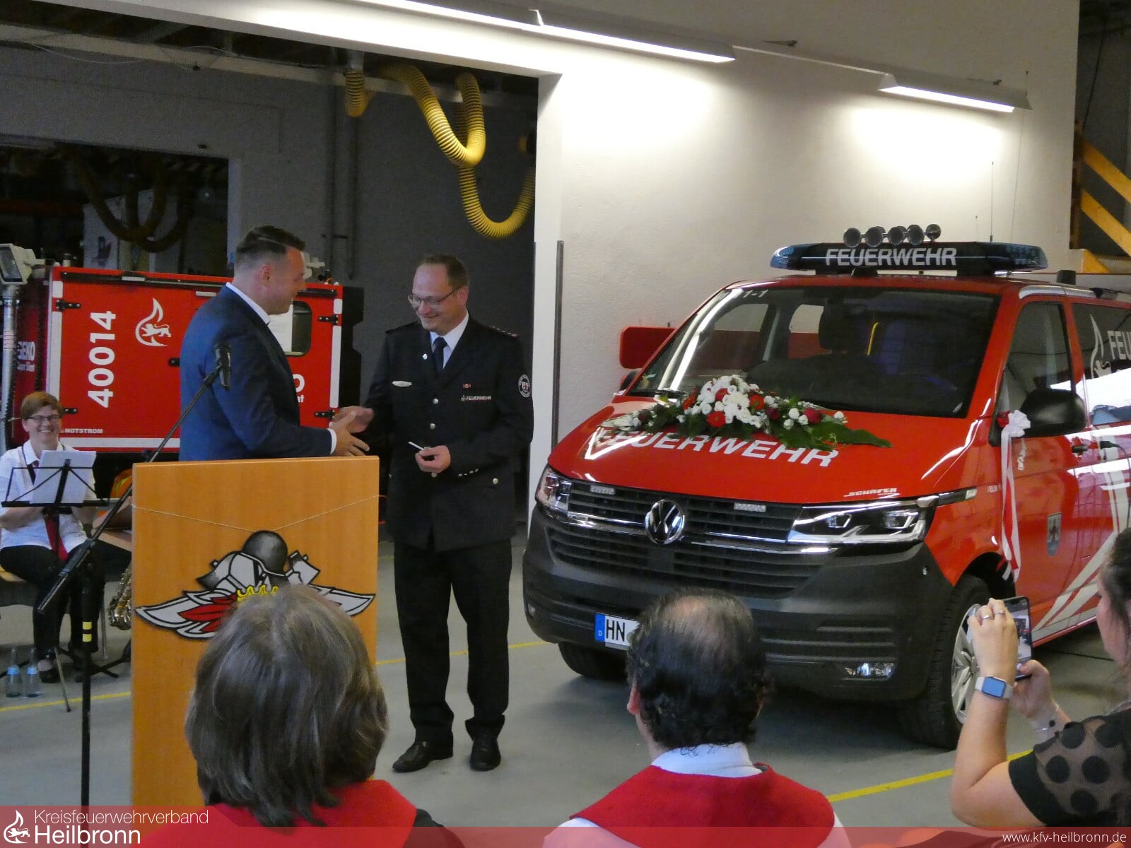 Mit dem Lob für alle Feuerwehrleute für das ehrenamtliche Engagement und der Freude über die Segnung des Fahrzeugs durch die beiden Oedheimer Pfarrer überreichte er den Schlüssel für das glänzende Fahrzeug an Sven Kübler und an die Oedheimer Feuerwehr.