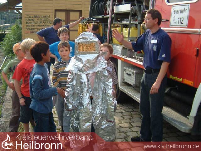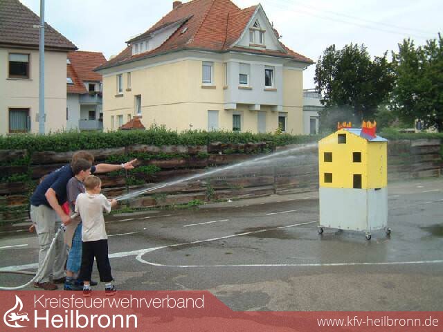 Am Tag darauf konnte Feuerwehrkommandant Albert Decker eine etwa gleichgroße Kinderschar zu Spiel und Spaß bei der Feuerwehr begrüßen. Nach auch hier die Einstimmung auf das Thema Feuerwehr mit einem Film erfolgt war. Aufgeteilt in Gruppen wurden verschiedene Stationen abgehandelt, bei denen Wasser, die Allzweckwaffe der Feuerwehr, die Hauptrolle spielte. Auf dem vorbereiteten Spieleparcours musste Wasser mit den verschiedensten Hilfsmitteln zur fiktiven Brandstelle transportiert werden.