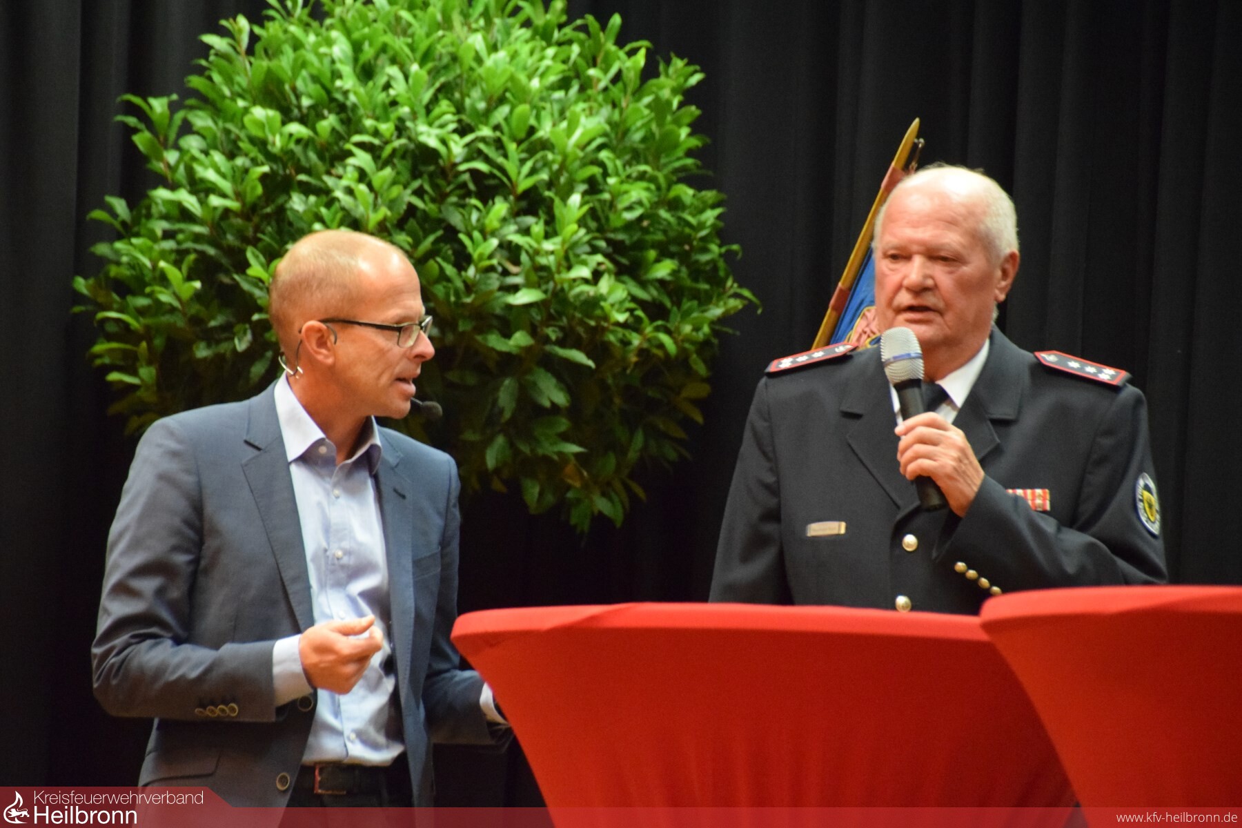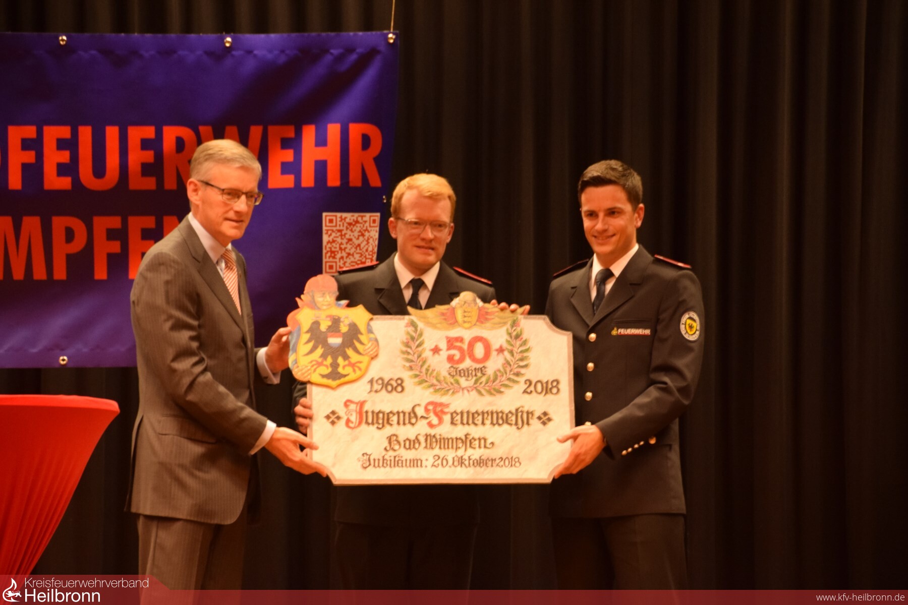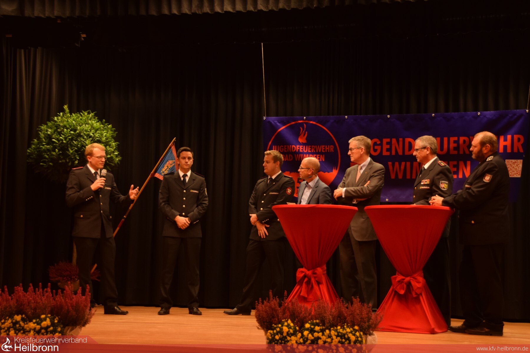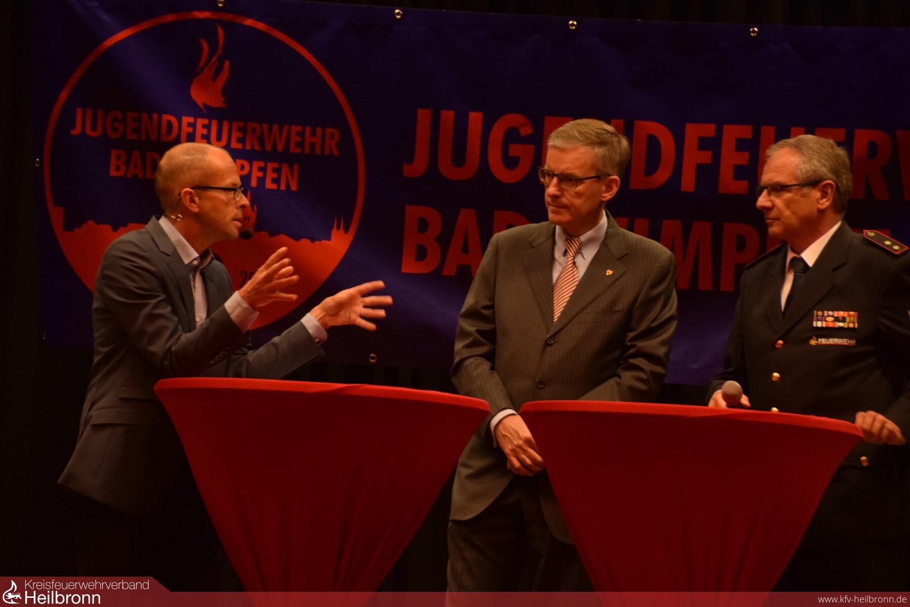 Zum Schluss der ersten Talkrunde berichtete noch Reinhold Korb über einen besonderen Arbeitseinsatz im Forst. Um die noch heute stehende Forsthütte bauen zu können musste eine größere Baumwurzel entfernt werden. Nach reichlicher Planung wurde diese Baumwurzel einfach in die Luft gesprengt, und Frieder Klenk sprach noch über seinen ersten Einsatz beim Dachstuhlbrand des Geschäftshaus Eisen Weyhing. Bürgermeister Claus Brechter betonte die Bedeutung und Wichtigkeit der Feuerwehren. Vor allem für Bad Wimpfen mit ihrer historischen Altstadt. Weiterhin bemerkte er das die meisten aktiven Mitglieder aus der Jugendfeuerwehr kommen und dass es ohne das Ehrenamt keine Feuerwehr gäbe. Reinhold Gall, der Vorsitzende des Kreisfeuerwehrverband und Mitglied des Landtags, stellte seine Beweggründe dar, warum er ein Feuerwehrmann geworden ist. Er wollte etwas für das Gemeinwohl tun, hat sich gerne eingebracht und sah in der Feuerwehr einen Sinn fürs Leben. Heiner Schiefer in seiner Funktion als stellvertretender Kreisbrandmeister sprach über die Aufgaben der Feuerwehren früher und heute. Durch die immer höher werdende Gefahrenlage verzeichnen die Feuerwehren steigende Einsatzzahlen in allen Bereichen wie Feuer, technische Hilfeleistungen, Chemie oder Verkehrsunfälle. Als Vertreter der Kreisjugendfeuerwehr sagte Dominik Häberlen, das die Feuerwehren im Landkreis mit ihren Jugendfeuerwehren gut aufgestellt sind, aber die Nachwuchsfindung immer schwieriger wird.