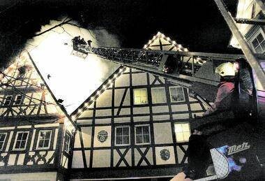 Nur wenige Stunden nach dem Feuer in Stein schlugen um 17 Uhr die Flammen aus dem Dach eines Fachwerkhauses in der Möckmühler Altstadt in den Nachthimmel. Eine heikle Situation für die Floriansjünger: Das Gebäude in der Marktstraße 8, in dem sich eine Buchhandlung und eine leer stehende Wohnung befinden, ist eingebettet zwischen Bäcker und Schreibwarengeschäft. An der Rückseite grenzt direkt ein weiteres Gebäude an.