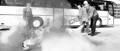 Dies war zum Glück kein Ernstfall, sondern nur eine Übung. Deshalb entfacht Oppenländer mit alten Zeitungen und Benzin gleich ein neues Feuer, das die Busfahrer Jovic Dusan und Milorad Gledic löschen müssen. Das Reisebüro Gross trainiert in Kleingruppen mit jedem seiner 30 Fahrer Verhalten in Unfallsituationen.