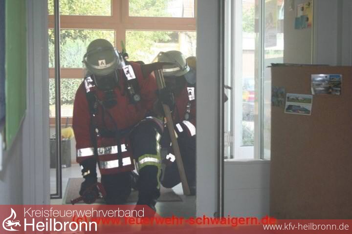 Schnell handeln die anwesenden Erzieherinnen und geben das Alarmsignal zur Räumung des Kindergartens. Parallel dazu wird über den Notruf 112 die Feuerwehr alarmiert. Nun geht alles ganz schnell. Die Angehörigen der Abteilung Niederhofen werden über ihre digitalen Meldeempfänger zum fiktiven Brandeinsatz in den Leinburgweg alarmiert. Schnell ist es vorbei mit der Ruhe im Teilort. Mit Blaulicht und Martinshorn, wie im richtigen Einsatz, fährt das rote Auto vor. Schnell und routiniert geht alles Hand in Hand. Während der Gruppenführer erkundet, bereiten die Männer den Löschangriff vor. Wie im richtigen Leben war es auch bei dieser Übung. Die Erzieherinnen haben sich bei der Anwesenheitskontrolle verzählt und ein Kind als vermisst gemeldet, worauf die Menschenrettung veranlasst wurde. Nachdem bekannt wurde, dass sich doch alle Kinder am Sammelplatz aufhielten konnten die Wehrmänner schnell den eigentlichen Brandherd im Heizungskeller ausfindig machen und bekämpfen, um bereits nach kurzer Zeit Feuer Schwarz melden.
