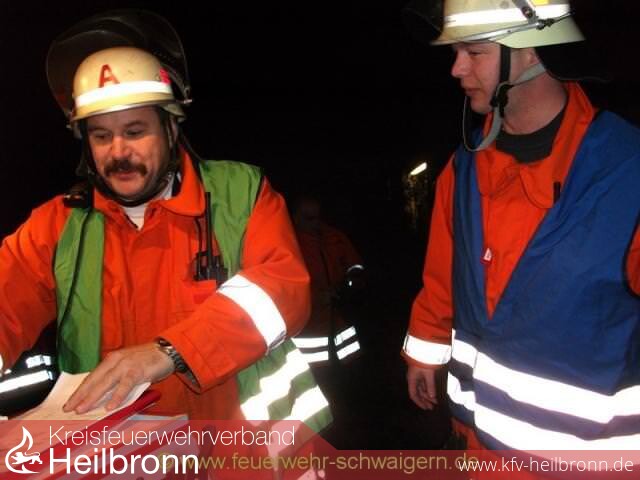 Am Mittwochabend herrschte kurz vor 19 Uhr noch trügerische Stille im Schwaigerner Industriegebiet, ein kalter Wind zieht durch die Daimlerstraße. Nur drei Personen, die beiden Feuerwehrmänner Jürgen Kachel und Timo Decker, sowie Kurt Schmalzhaf von der Fa. Söhner, huschen um das Gebäude und überprüfen ein letztes Mal die getroffenen Vorbereitungen für die unangekündigte Übung.